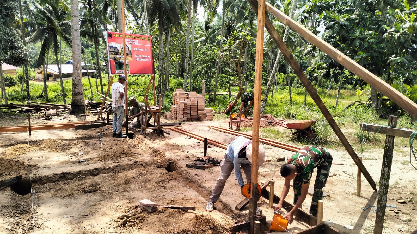 Fokus pekerjaan kali ini adalah pengecoran tiang bangunan, yang menjadi elemen penting dalam struktur rumah. Pekerjaan dilakukan secara gotong royong oleh anggota TNI bersama warga setempat. Kegiatan tersebut menjadi bagian dari upaya mewujudkan rumah yang lebih kokoh dan layak huni bagi Rahman dan keluarganya.