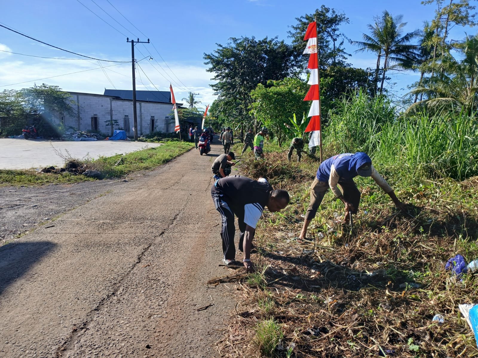 Kegiatan ini dilakukan sebagai bentuk kepedulian terhadap kebersihan lingkungan sekaligus mempererat hubungan antara TNI dan masyarakat. Puluhan personil Koramil bersama warga turun langsung membersihkan semak-semak dan sampah di sepanjang bahu jalan desa yang selama ini mulai tertutup oleh rerumputan liar.