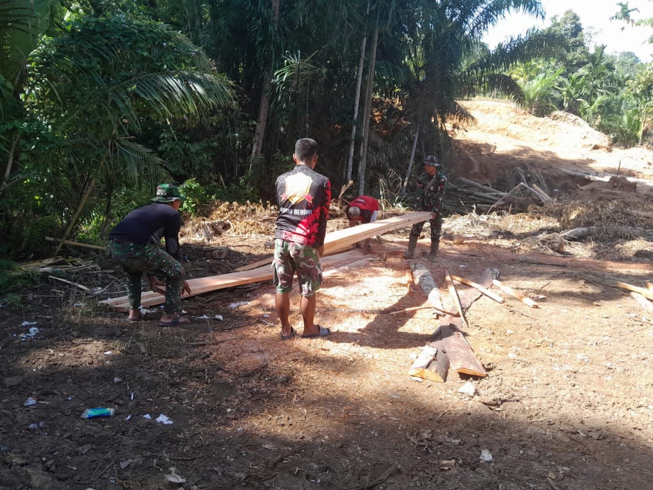 Hal itu terlihat saat anggota TNI Kodim 0408/BS yang tergabung dalam Satgas TMMD terlihat Kompak saat menurunkan material kayu.