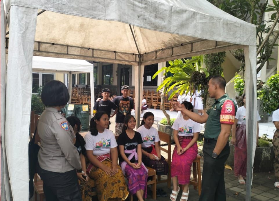 Bangli – Dalam rangka mempererat kemanunggalan TNI dengan rakyat serta membina semangat kebangsaan di kalangan generasi muda, Babinsa Kelurahan Kawan, Koramil 01/Bangli, Kodim 1626/Bangli, Sertu Wayan Budiarta bersama Bhabinkamtibmas Kelurahan Kawan melaksanakan kegiatan anjangsana dan Komunikasi Sosial (Komsos) dengan pengurus dan anggota OSIS serta siswa SMA Negeri 1 Bangli, yang berlokasi di Jl. Brigjen Ngurah Rai, Kelurahan Kawan, Kecamatan Bangli. Kamis (23/10/25).