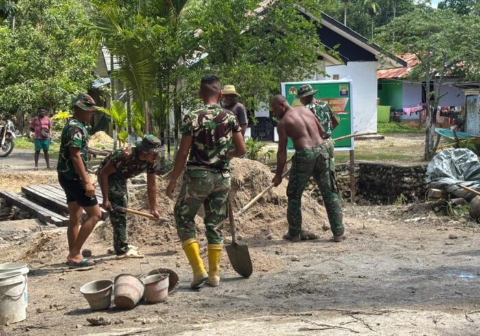 Kendari – Di tengah teriknya matahari Kota Kendari, semangat pembangunan terus bergelora di Kelurahan Anggoeya. Personel Satgas TMMD ke-127 Kodim 1417/Kendari terlihat aktif dan terampil dalam menyusun batu dan semen guna memperkokoh fondasi bahu jalan di lokasi yang menjadi sasaran perbaikan jembatan pada Rabu (11/2).