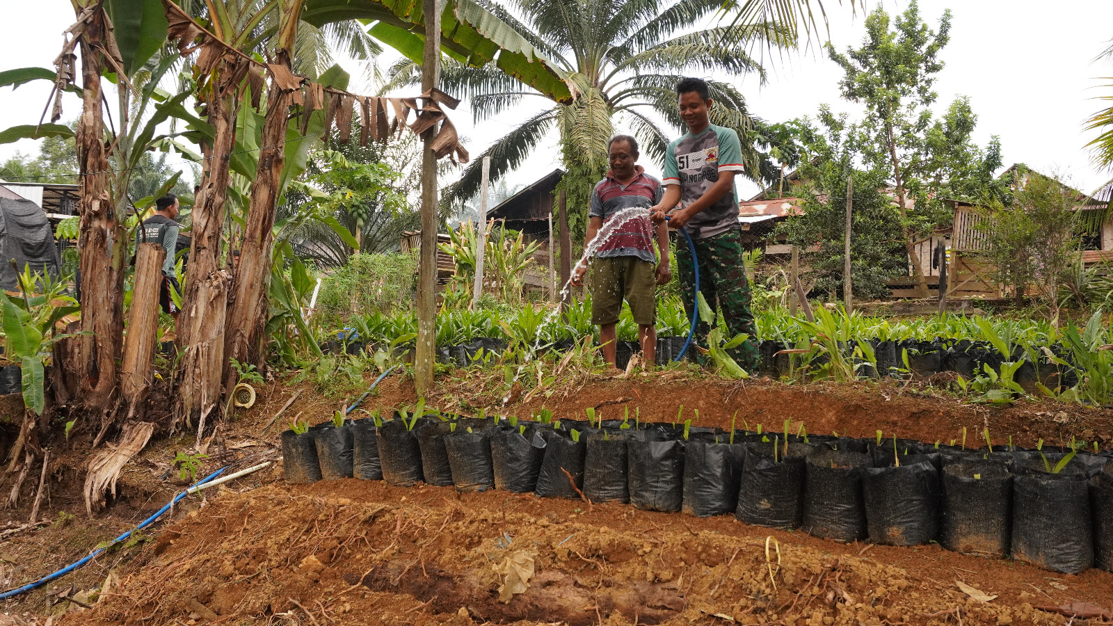 Dalam kegiatan tersebut, anggota Satgas TMMD, Praka Erwanto, memanfaatkan waktu istirahatnya untuk membantu menyiram bibit sawit milik Suparman yang berada di sekitar area sasaran TMMD. Aksi ini mencerminkan komitmen TNI untuk tidak hanya fokus pada pembangunan fisik, tetapi juga menjalin kedekatan dengan warga melalui aktivitas sosial.