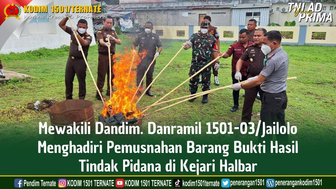 Kodim 1501/Ternate, Halbar – Bertempat di halaman kantor Kejaksaan Negeri Kab. Halbar dilaksanakan kegiatan Pemusnahan barang bukti Kejaksaan Negeri Kabupaten Halmahera Barat yg diselenggarakan oleh Kejaksaan Negeri Kab. Halbar. Pada kegiatan ini Danramil 1501-03/Jailolo, Lettu Inf Yus Budi A.Md.Kep., hadir mewakili Dandim 1501/Ternate. Rabu (16/7/2025).