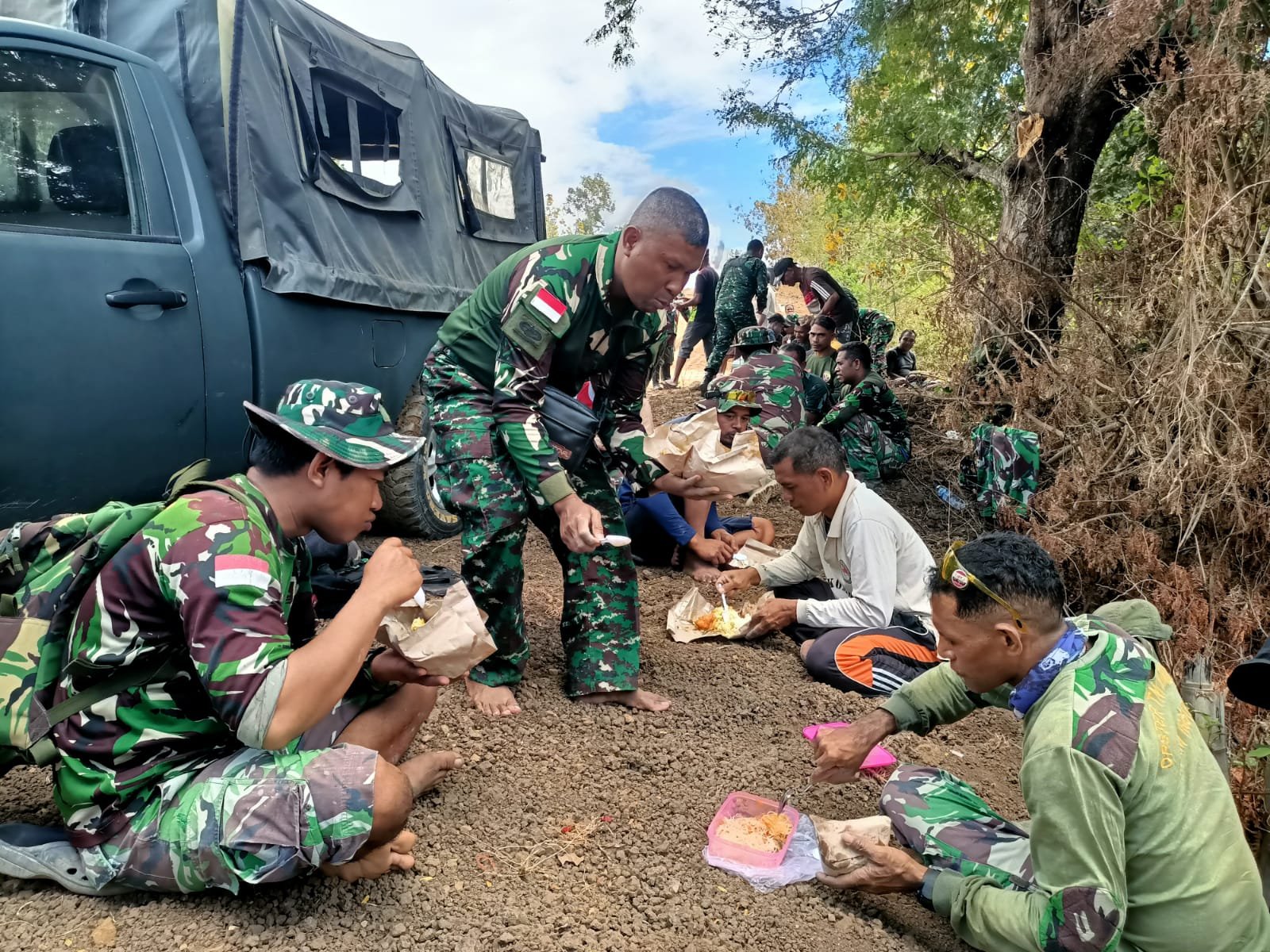 BELU, Senin (29/7/2025) — Suasana akrab dan penuh kehangatan terlihat di lokasi TMMD ke-125 Kodim 1605/Belu. Usai bekerja bersama membangun tembok penahan jalan, Satgas TMMD bersama masyarakat Desa Naekasa menikmati makan siang sederhana yang penuh makna.