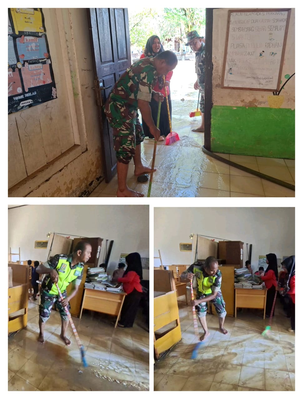 Para Babinsa bersama guru dan murid bahu-membahu membersihkan lumpur dan sampah yang memenuhi ruang kelas, halaman, serta lingkungan sekitar sekolah. Selain pembersihan, mereka juga melakukan pendataan terhadap kerusakan fasilitas sekolah akibat banjir.