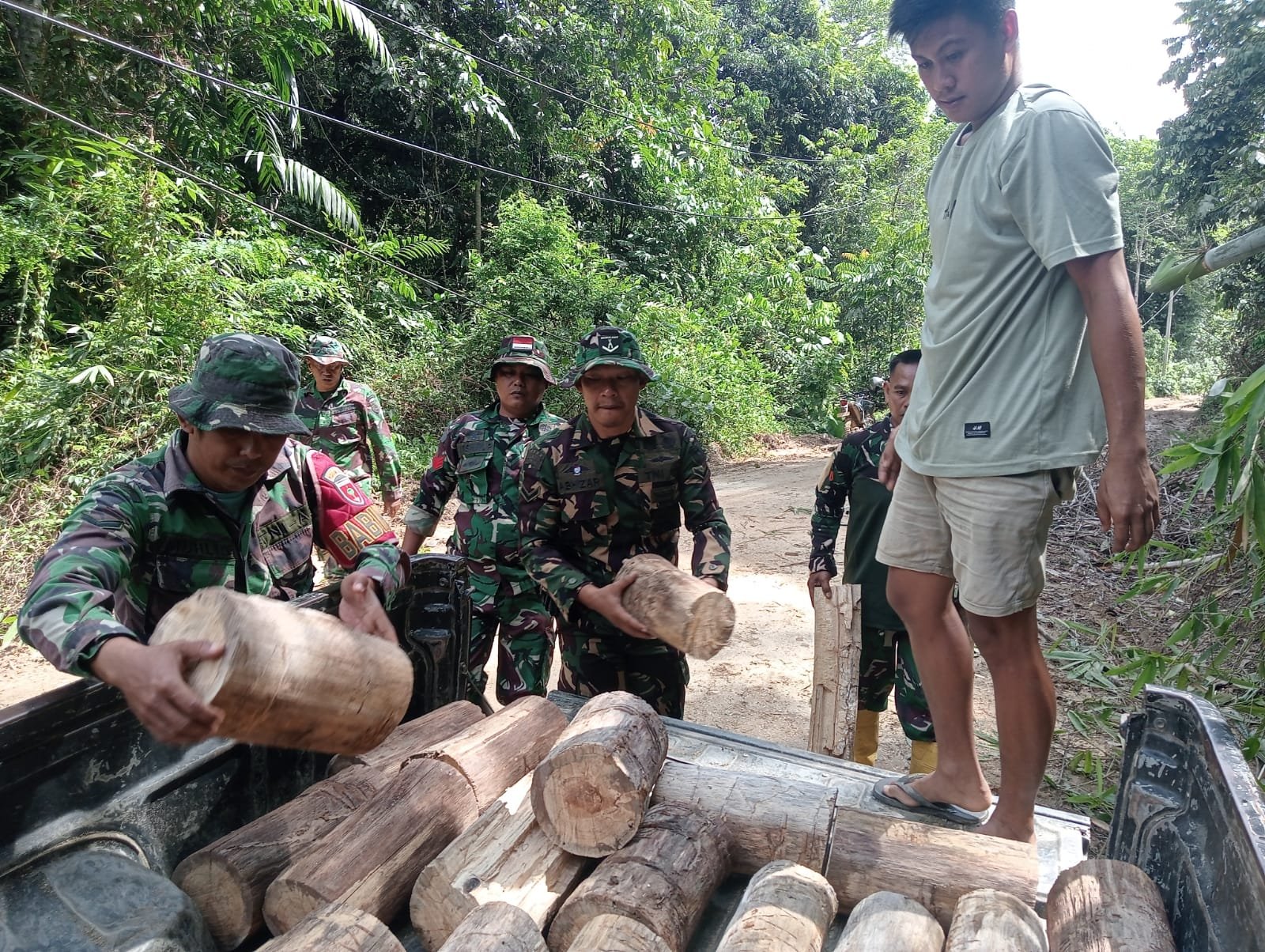 Tanpa ragu, para prajurit bahu-membahu mengangkat kayu bersama warga, meski cuaca cukup panas dan medan yang dilalui terbilang sulit. Kepedulian ini sontak mengundang apresiasi dari masyarakat yang merasa senang atas kehadiran TNI di desanya.