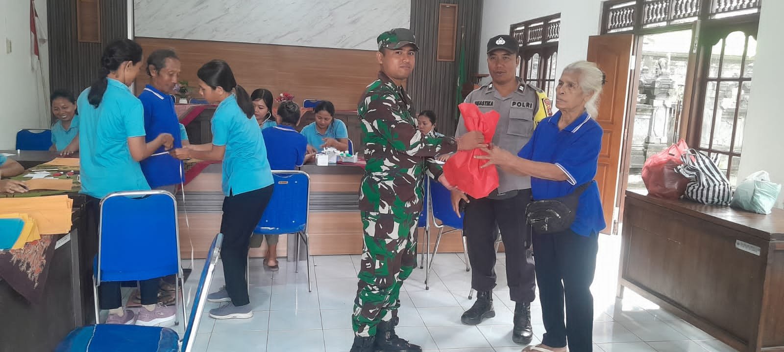 Klungkung,- Babinsa Selisihan Serda Dewa Wasista bersinergi bersama Bhabinkamtibmas melaksanakan pendampingan kegiatan Posyandu Lansia yang diselenggarakan Pemdes dengan menggandeng Petugas Kesehatan Klungkung ll.