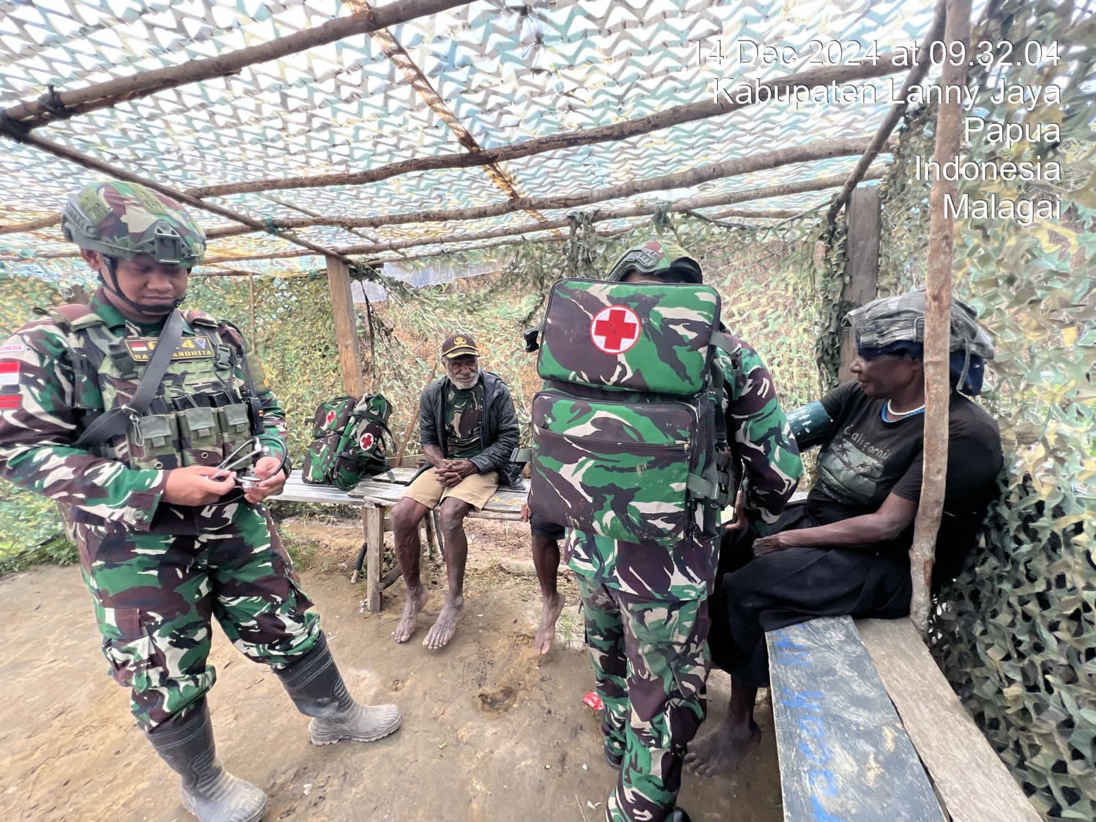 LANNY JAYA – Satgas Yonif 614/Raja Pandhita Pos Popome yang dipimpin oleh Bintara Kesehatan (Bakes) Serda Rizky bersama tim kesehatan Pos Popome memberikan pelayanan kesehatan kepada warga di Desa Popome, Distrik Mokoni, Kabupaten Lanny Jaya, Papua Pegunungan.