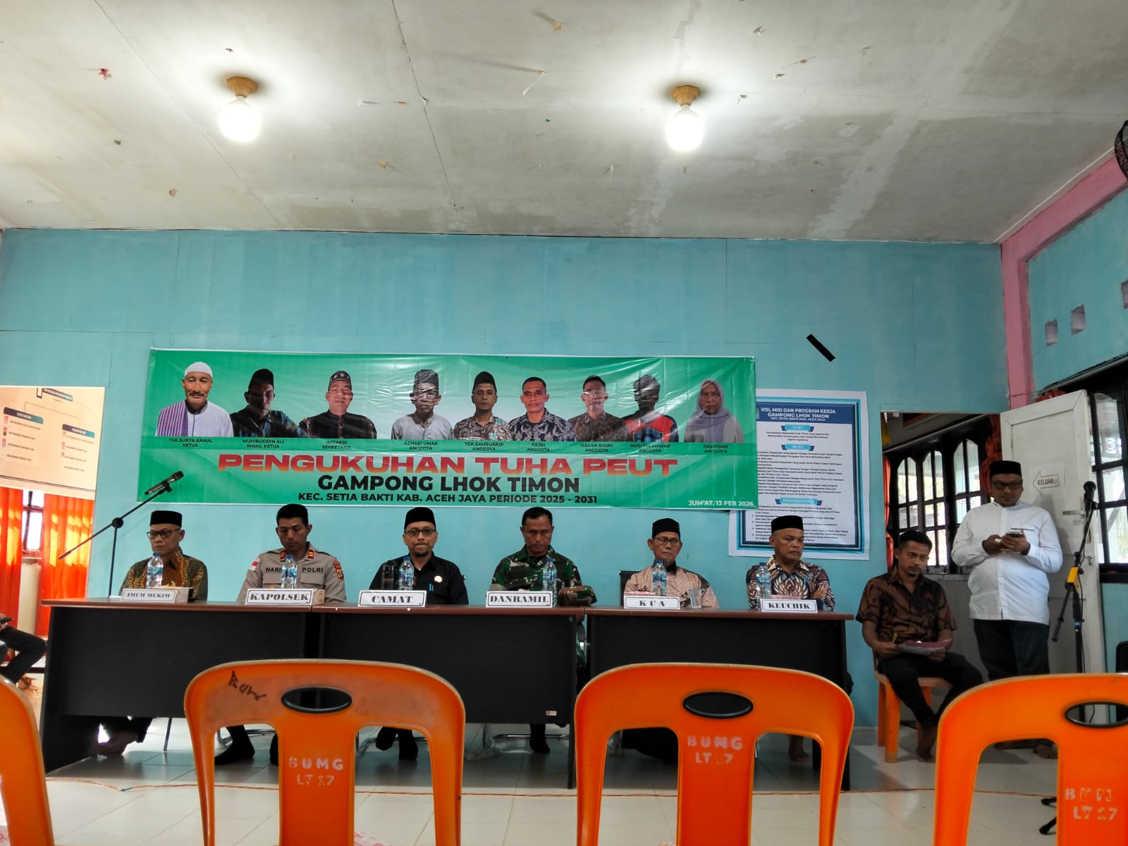 Kegiatan tersebut dihadiri sekitar 50 orang, di antaranya Camat Setia Bakti T. Arif Alfian, Danramil 03/Setia Bakti yang diwakili Batituud Serma Sugeng, Kapolsek Setia Bakti Iptu Haris, Kasi Pemerintahan Kecamatan Setia Bakti Amardani, S.Sos., Keuchik Desa Lhoktimon, serta ketua dan anggota Tuha Peut yang dilantik.