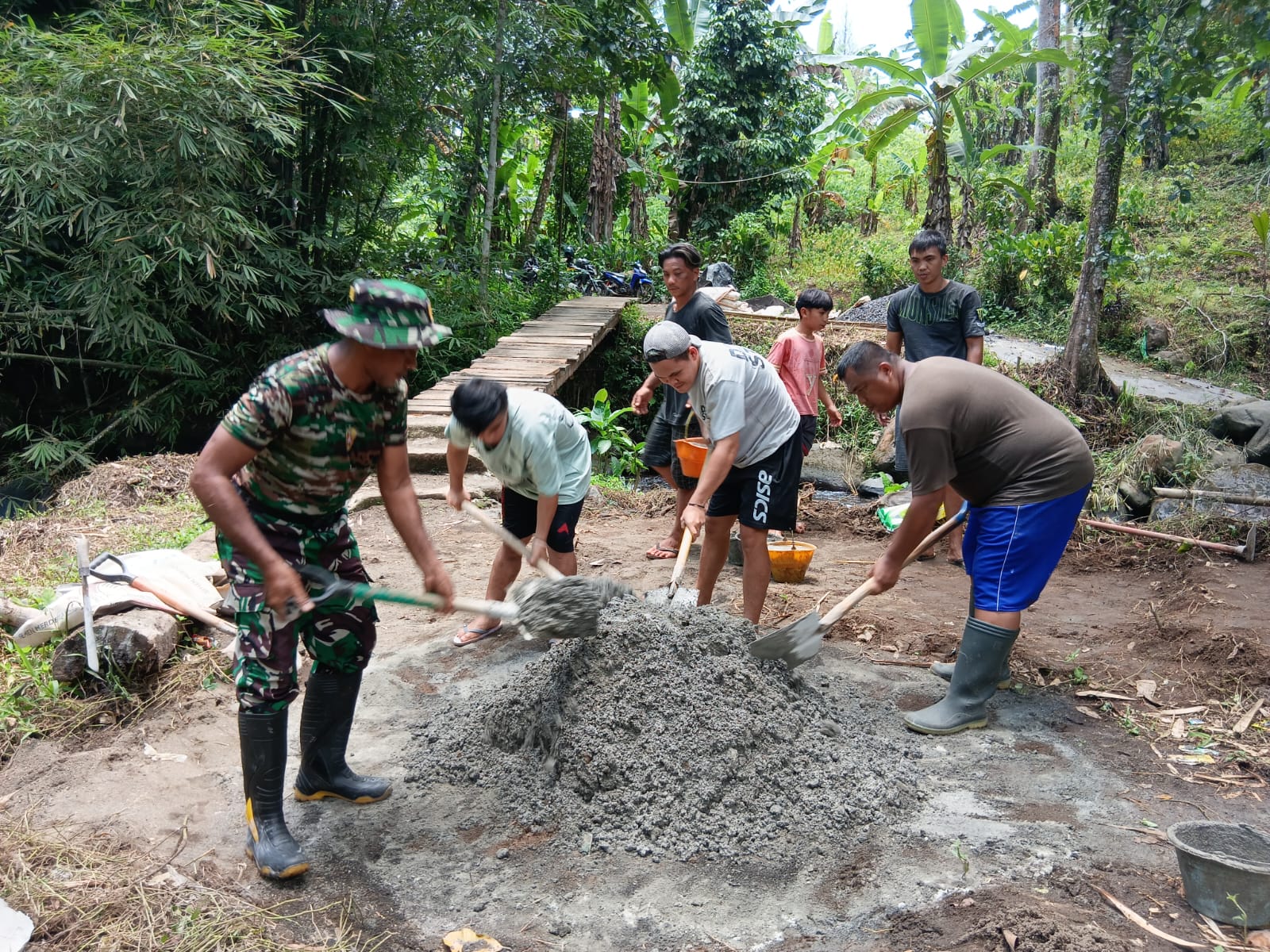 Setelah prosesi peletakan batu, pembangunan jembatan dilanjutkan melalui gotong royong yang melibatkan TNI, pemerintah desa, dan masyarakat. Kegiatan ini mencerminkan semangat kebersamaan dan kerja sama yang erat, serta menampilkan nilai-nilai kemanunggalan TNI dengan rakyat.