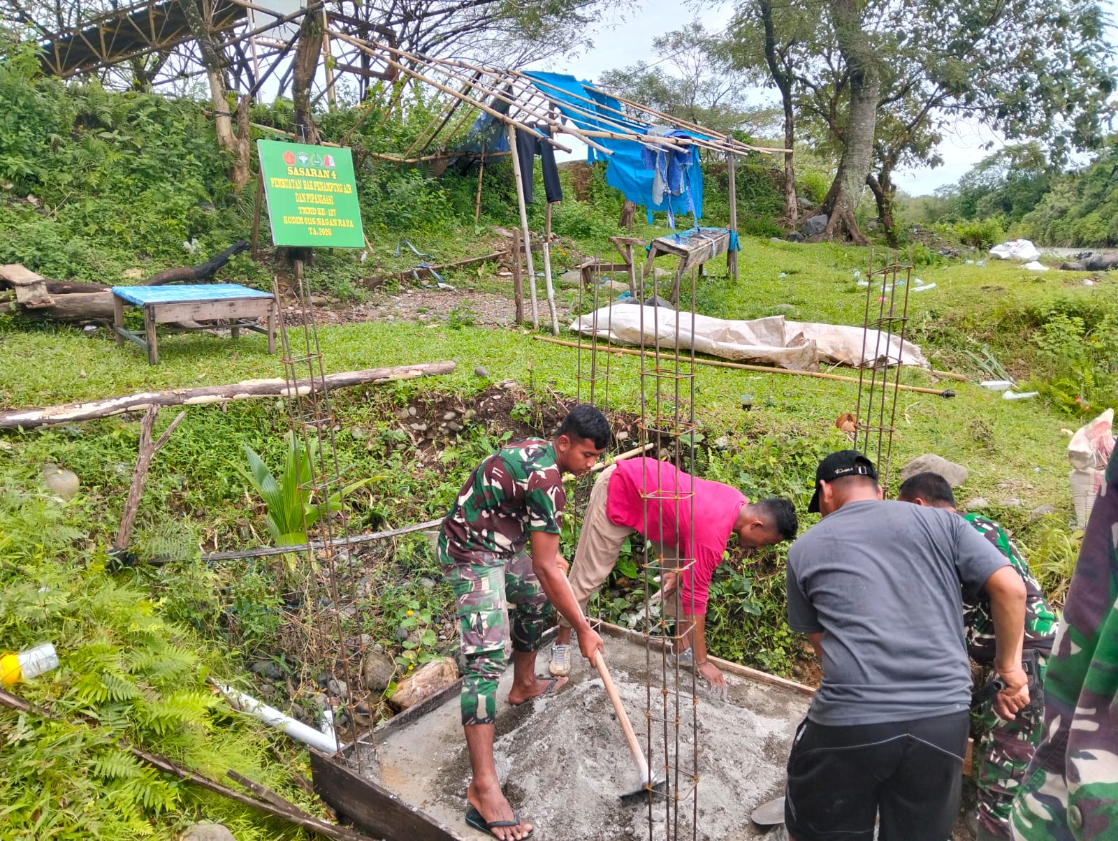 NAGAN RAYA – Suasana kebersamaan tampak mewarnai pelaksanaan program TMMD Ke-127 Kodim 0116/Nagan Raya saat pembangunan bak penampungan air bersih memasuki tahap pengecoran lantai dasar, Rabu (18/2/2026).
