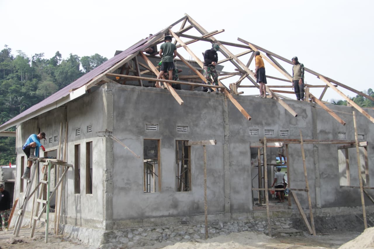 Para personel Satgas TMMD tidak ragu untuk memanjat rangka bangunan demi mempercepat penyelesaian proyek. Meskipun pemasangan atap memerlukan ketelitian serta keberanian, terutama saat bekerja di ketinggian, semangat prajurit untuk membantu masyarakat tidak pernah pudar.