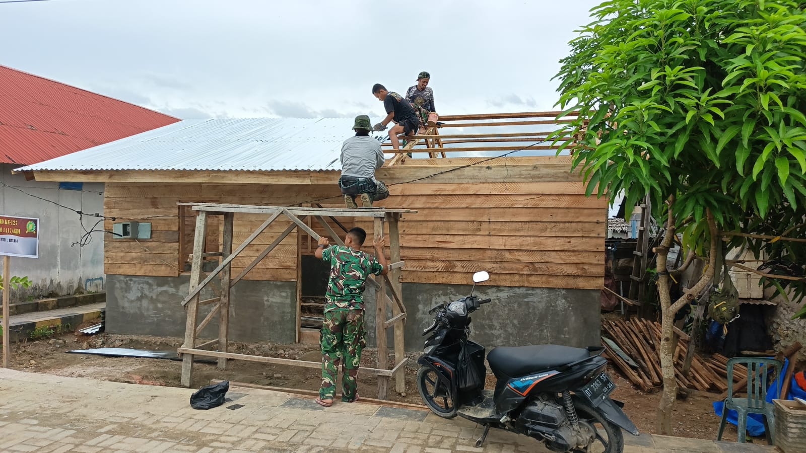 Personel TNI, bekerja sama dengan masyarakat setempat, terlihat bersinergi saat mereka menaikkan lembaran seng dan memasangnya pada struktur rangka atap yang telah dibangun dengan kokoh. Proses ini dilakukan secara teliti untuk menjamin bahwa atap terpasang dengan baik dan aman.
