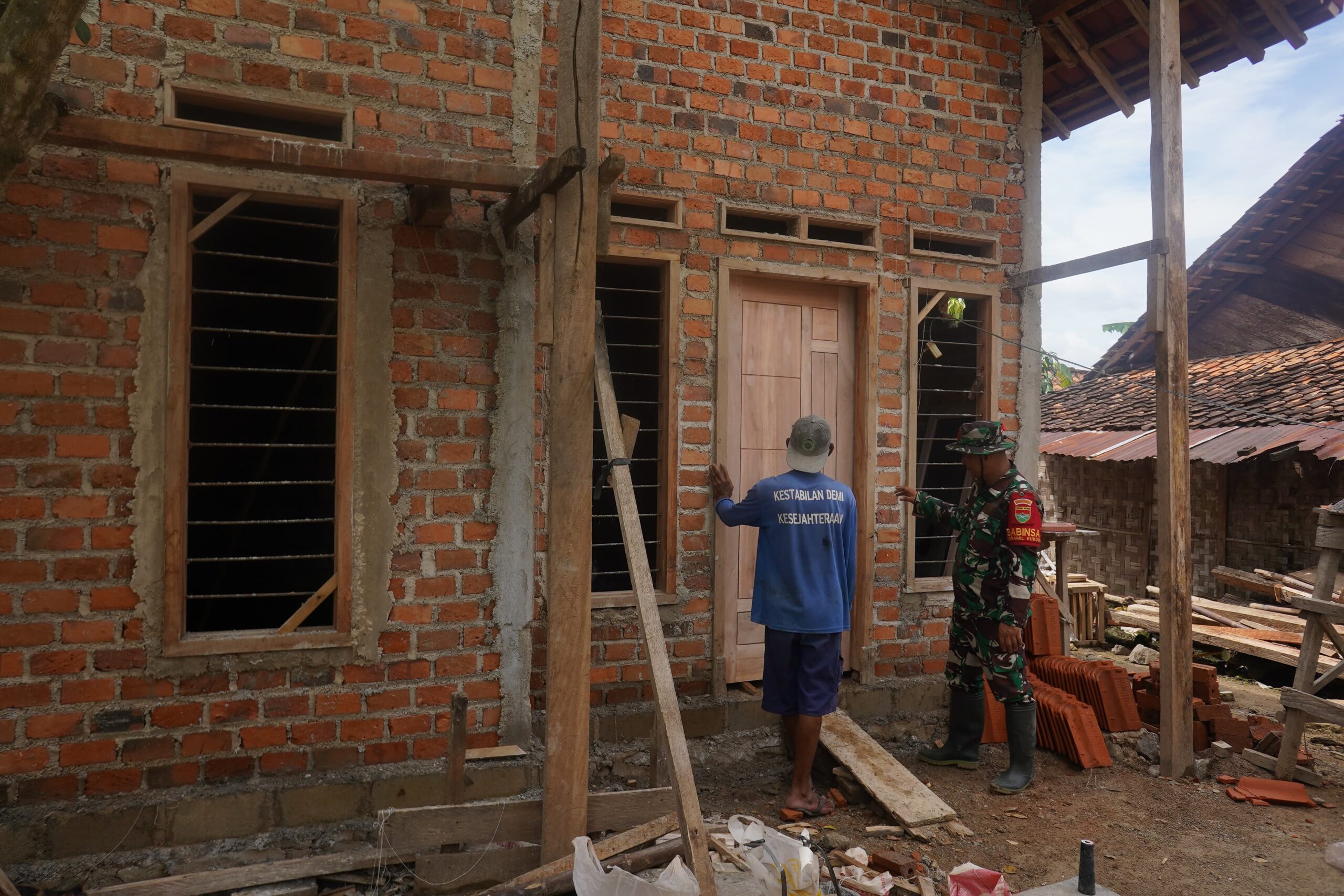 Kabupaten Pesawaran – Proses pembangunan Rumah Tidak Layak Huni (RTLH) dalam rangka kegiatan TNI Manunggal Membangun Desa (TMMD) Ke 127 yang dilaksanakan oleh Kodim 0421/LS terus berlangsung dengan baik. Saat ini, tim pembangunan sedang melakukan pemasangan daun pintu pada salah satu unit RTLH, yang menandakan masuknya tahap akhir dalam proses pembangunan rumah tersebut.