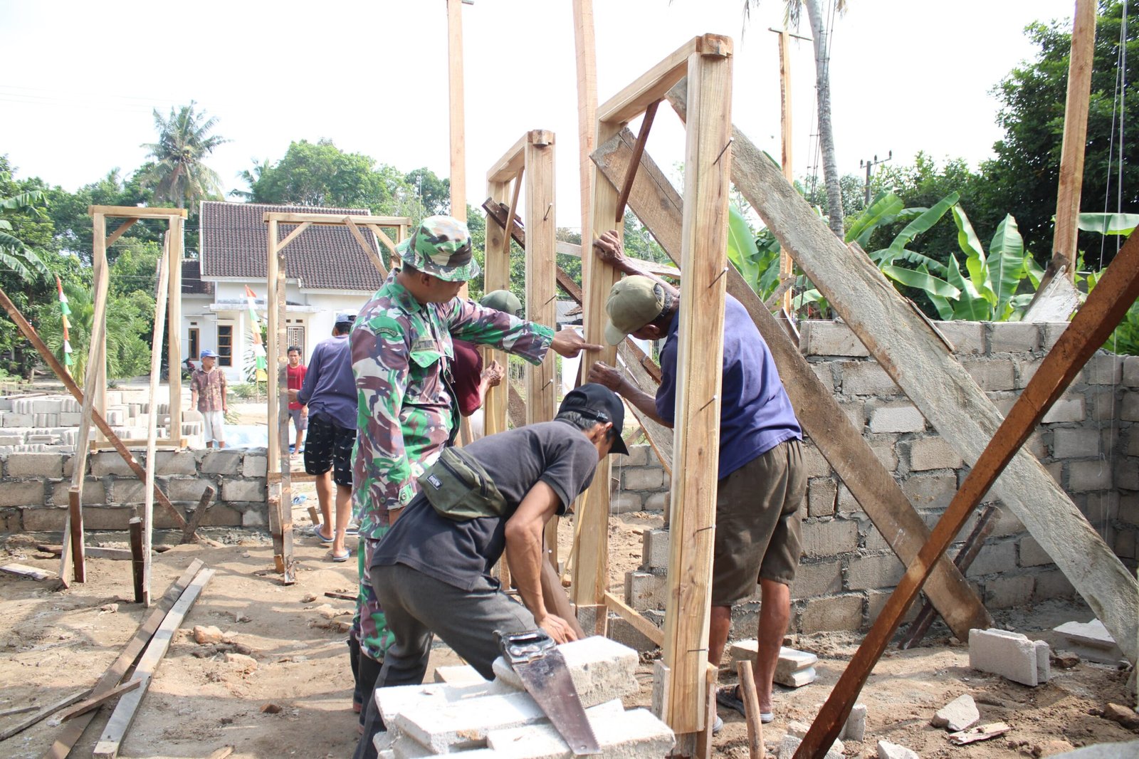 Pemasangan kusen ini membuat tampilan rumah semakin terlihat utuh. Warga penerima RTLH mulai bisa melihat wujud nyata dari impian mereka memiliki rumah layak huni. Kehadiran TMMD tak hanya membangun rumah, tapi juga membangun harapan baru bagi keluarga kurang mampu di kampung tersebut.