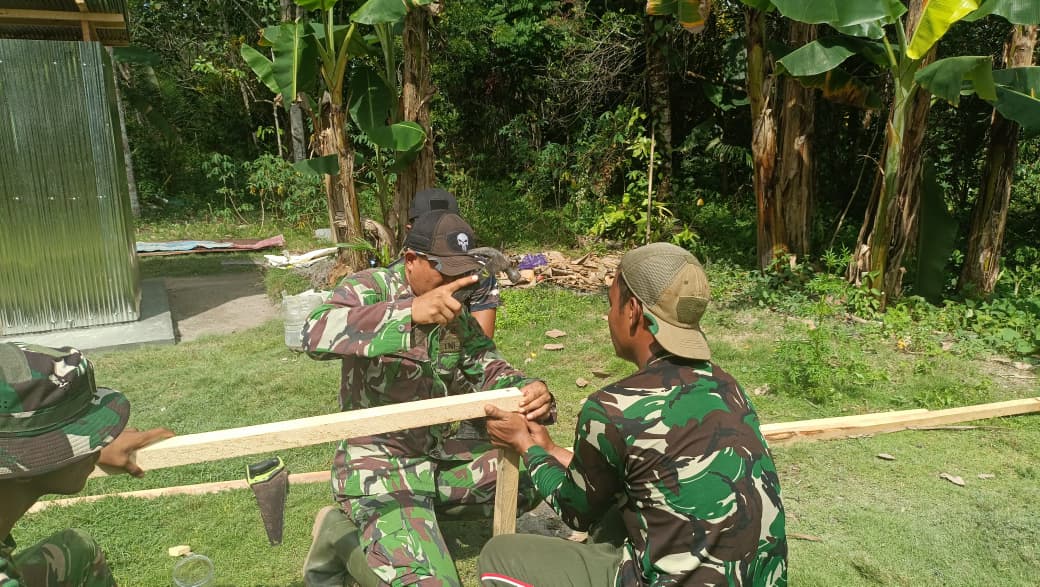 Pangkalan Banteng – Di tengah pelaksanaan Program TMMD Ke-128 oleh Kodim 1014/Pbn, proyek pembangunan MCK di Desa Sungai Hijau, Kecamatan Pangkalan Banteng, menunjukkan perkembangan yang menggembirakan. Pada Kamis, tepatnya 30 April 2026, proses pemasangan dinding seng dan pembuatan rangka pintu untuk MCK milik Bapak Bari hampir menyentuh tahap akhir.