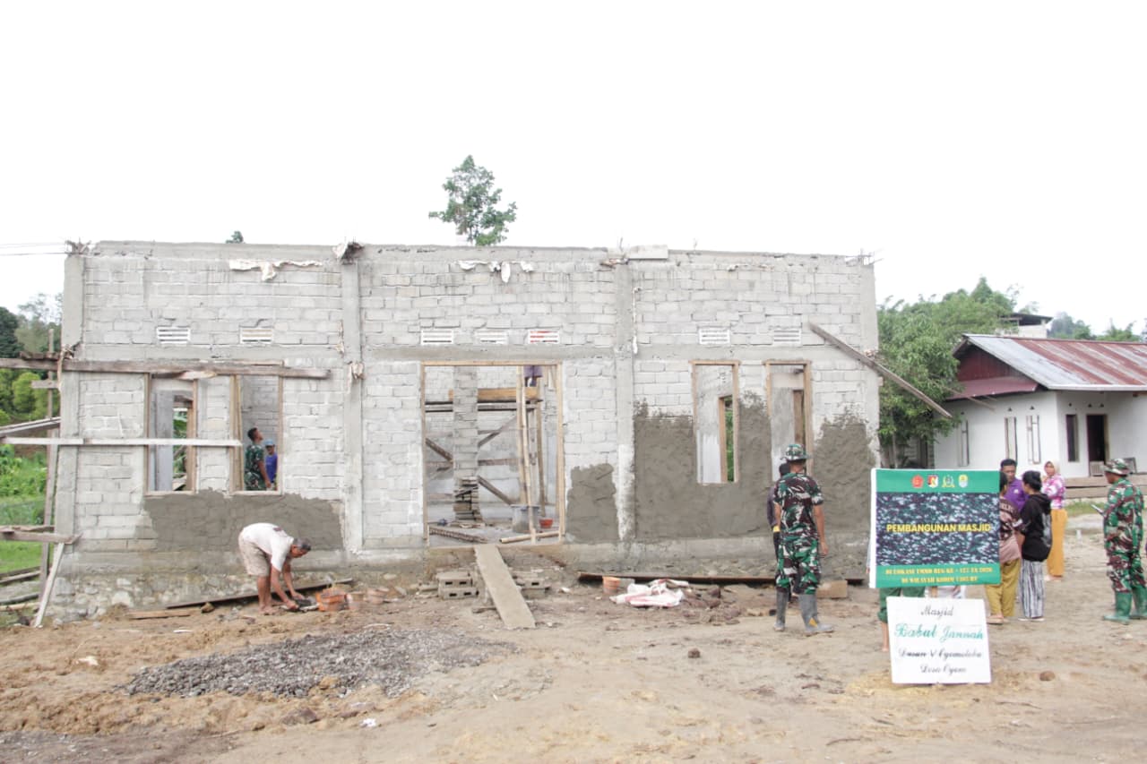 Pembangunan mesjid sebagai salah satu sasaran fisik dari program TMMD kali ini menjadi prioritas utama. Pada hari pelaksanaan, anggota Satgas dan masyarakat setempat bekerja sama fokus dalam menyelesaikan pengerjaan dinding serta perapian struktur bangunan agar proses pembangunan berjalan dengan baik dan efisien.