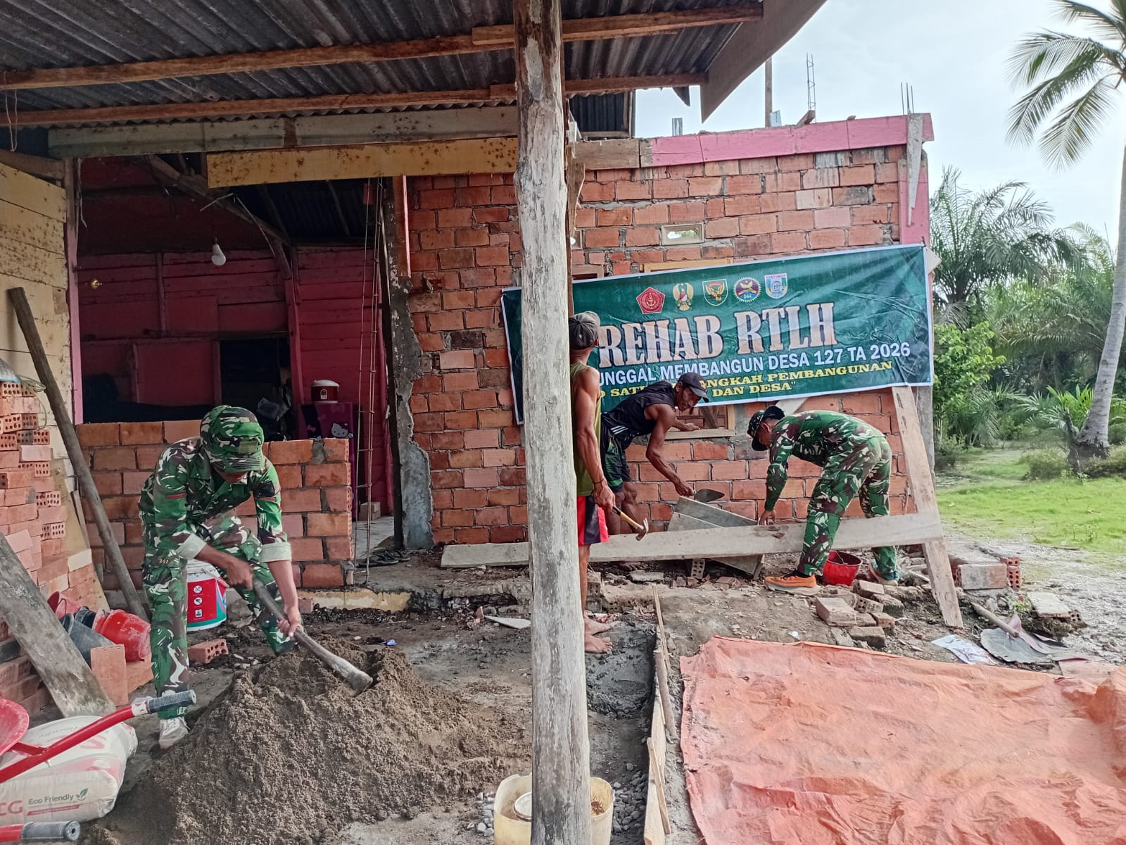 Banyuasin – Dalam upaya mempercepat proses pembangunan Rumah Tidak Layak Huni (RTLH) milik Bapak Paiman, Satgas TMMD 127 dari Kodim 0430/BA bekerja sama dengan masyarakat Desa Wonosari melaksanakan pemasangan tebeng layar. Kegiatan ini menjadi langkah krusial dalam penyelesaian struktur dinding rumah, memastikan kekuatan dan kerapian bangunan.