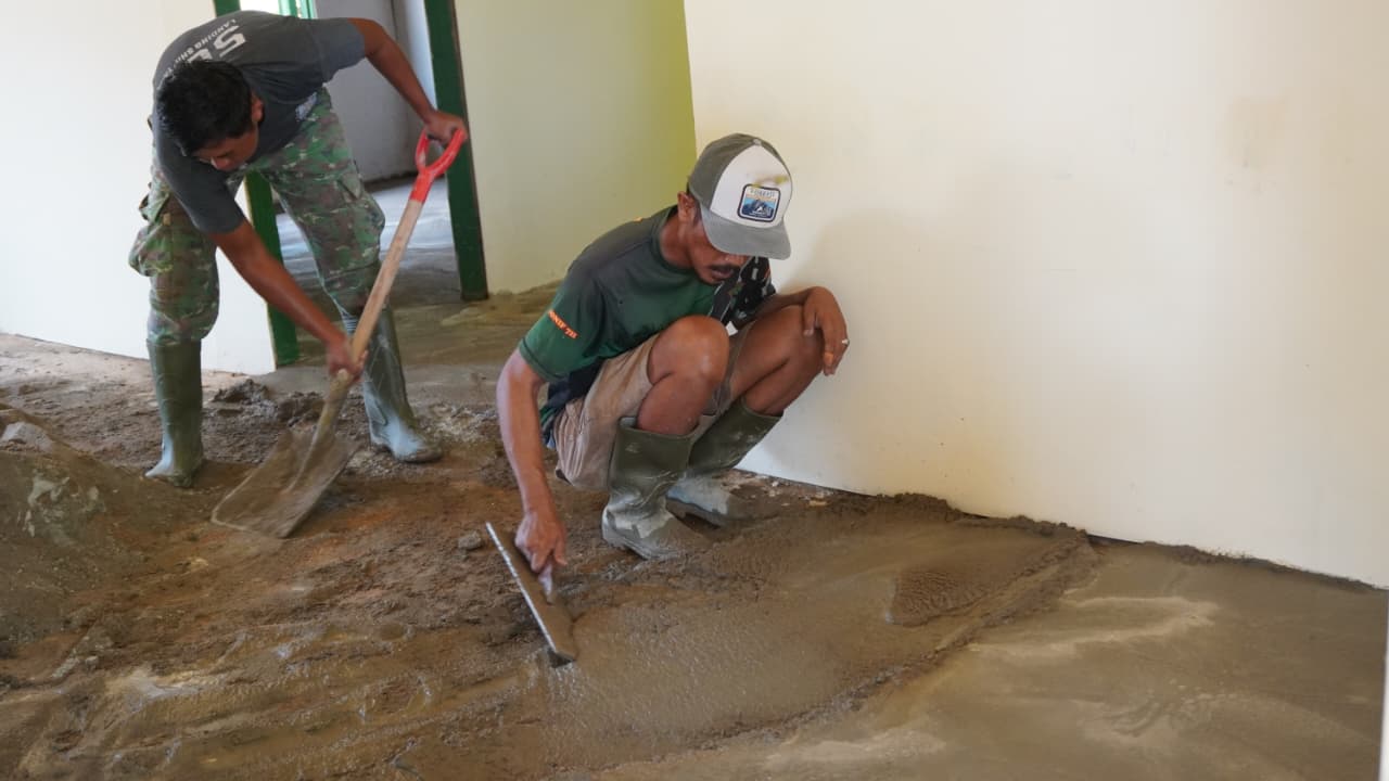 Anggota Satgas TMMD terlihat sangat hati-hati saat meratakan campuran semen di seluruh area lantai. Mereka mengawasi setiap sudut agar tidak ada bagian yang bergelombang, sehingga standar kualitas bangunan tetap terjaga dengan baik.