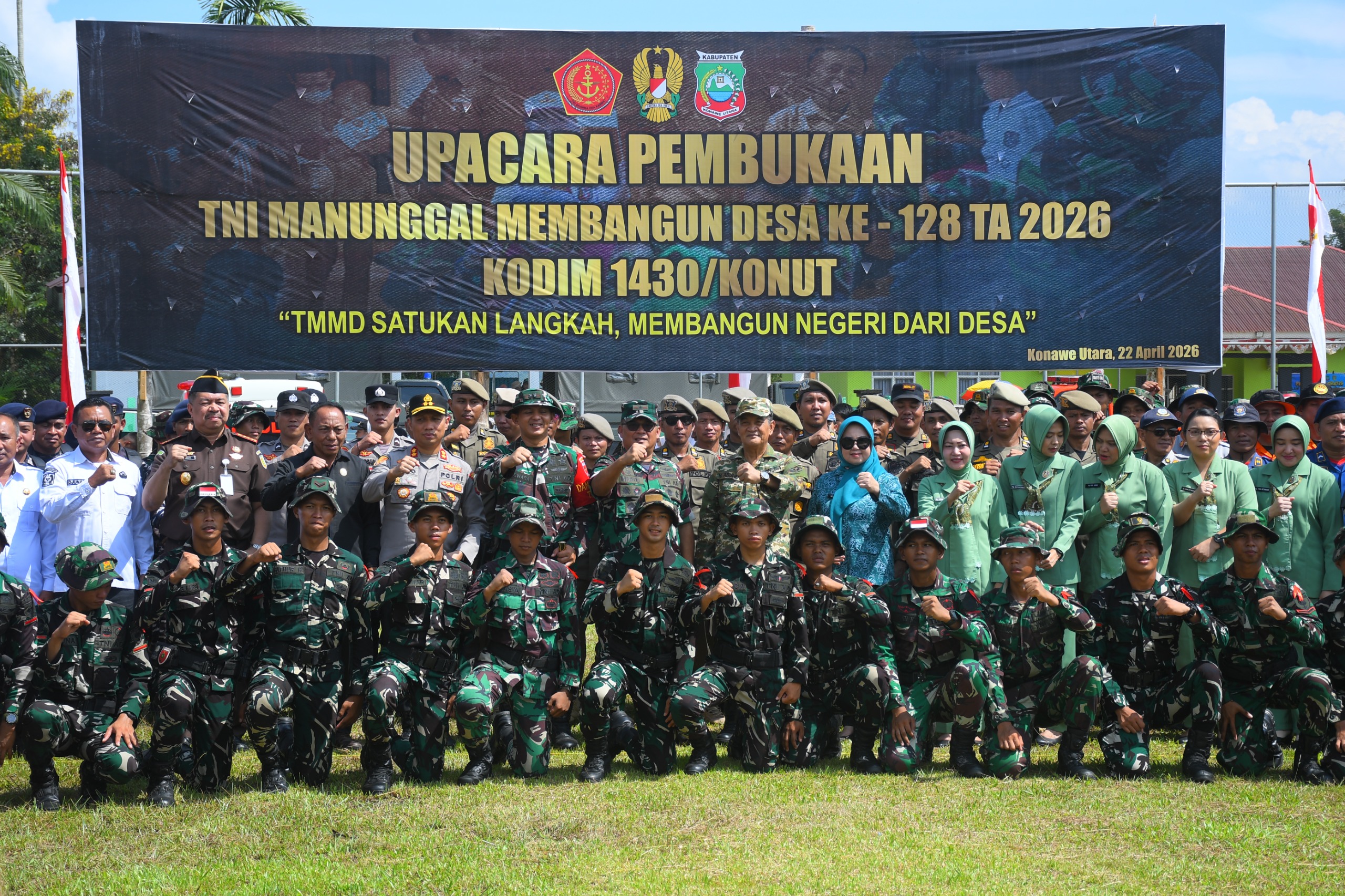 Konawe Utara – Program TNI Manunggal Membangun Desa (TMMD) ke-128 Tahun Anggaran 2026 Kodim 1430/Konawe Utara resmi dibuka melalui upacara yang berlangsung di Lapangan Sepak Bola Apdasi, Kelurahan Andowia, Kecamatan Andowia, Kabupaten Konawe Utara, pada Rabu (22/4/2026) pukul 09.00 WITA. Kegiatan ini mengusung tema “TMMD Satukan Langkah Membangun Negeri dari Desa” dan dihadiri oleh sekitar 300 peserta bersama tamu undangan.