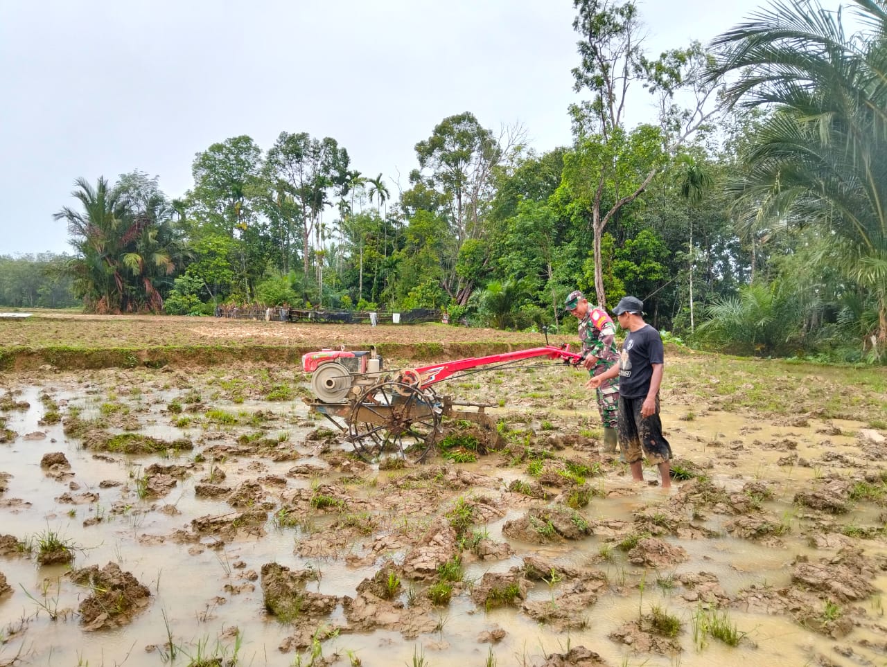 ACEH BARAT – Serka Medi Subandi, Babinsa Posramil 12/Panton Reu Kodim 0105/Abar, melaksanakan kegiatan pendampingan kepada petani dengan membantu proses membajak sawah di Gampong Tamping. Kehadiran Babinsa di tengah petani ini merupakan bagian dari upaya TNI dalam mendukung ketahanan pangan melalui pendampingan langsung di lapangan, Kamis (27/11/2025).