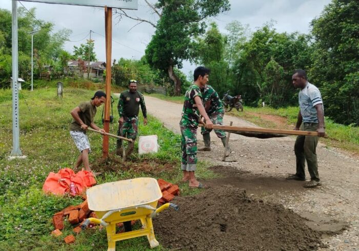 Di tengah panasnya cuaca, anggota TNI bersama warga tak mengenal lelah. Sejak pagi, mereka mengerjakan pengecoran jalan dengan semangat gotong royong yang tinggi.