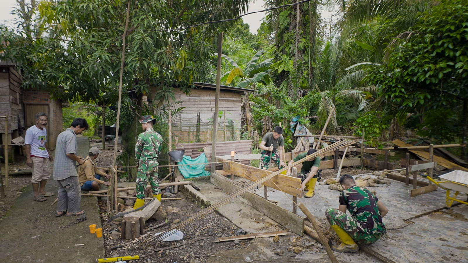 Di lokasi pembangunan, terlihat sejumlah anggota Satgas TMMD bekerja sama dengan warga setempat dalam merangkai kayu yang telah disiapkan untuk menjadi kusen. Proses ini dilakukan dengan sangat teliti, di mana setiap bagian kayu diukur dan disesuaikan dengan hati-hati agar menghasilkan rangka yang presisi, kuat, dan sejalan dengan desain rumah yang sedang dibangun.