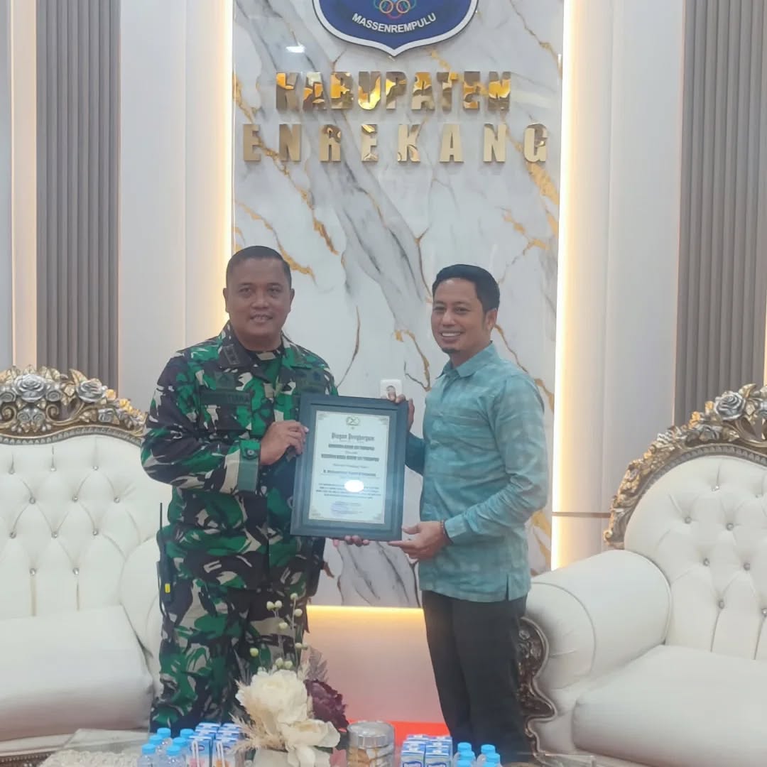 Enrekang – Sinergitas antara Tentara Nasional Indonesia (TNI) dan Pemerintah Daerah Kabupaten Enrekang kembali mendapatkan pengakuan yang berarti. Pada hari Kamis, 22 Januari 2026, Komandan Kodim 1419/Enrekang, Letkol Inf Augustiar Adinegoro, S.Hub.Int, menyerahkan Piagam Penghargaan dari Komandan Korem 141/Toddopuli, Brigjen TNI Andre Clift Rumbayan, S.Sos., M.M., kepada Bupati Enrekang, H. Muh Yusuf Ritangnga. Acara penyerahan tersebut berlangsung di ruang kerja Bupati Enrekang, yang dihadiri oleh berbagai pihak terkait.