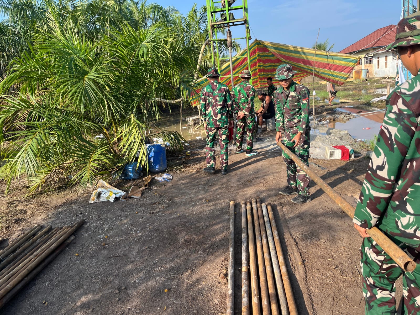 Banyuasin – Anggota Satgas TNI Manunggal Membangun Desa (TMMD) ke-127 Kodim 0430/Banyuasin bersama masyarakat setempat sedang berupaya keras untuk mempercepat pembangunan sumur bor titik ketiga. Lokasi proyek ini terletak di belakang Kantor Desa Wonosari, Kecamatan Pulau Rimau, Kabupaten Banyuasin.
