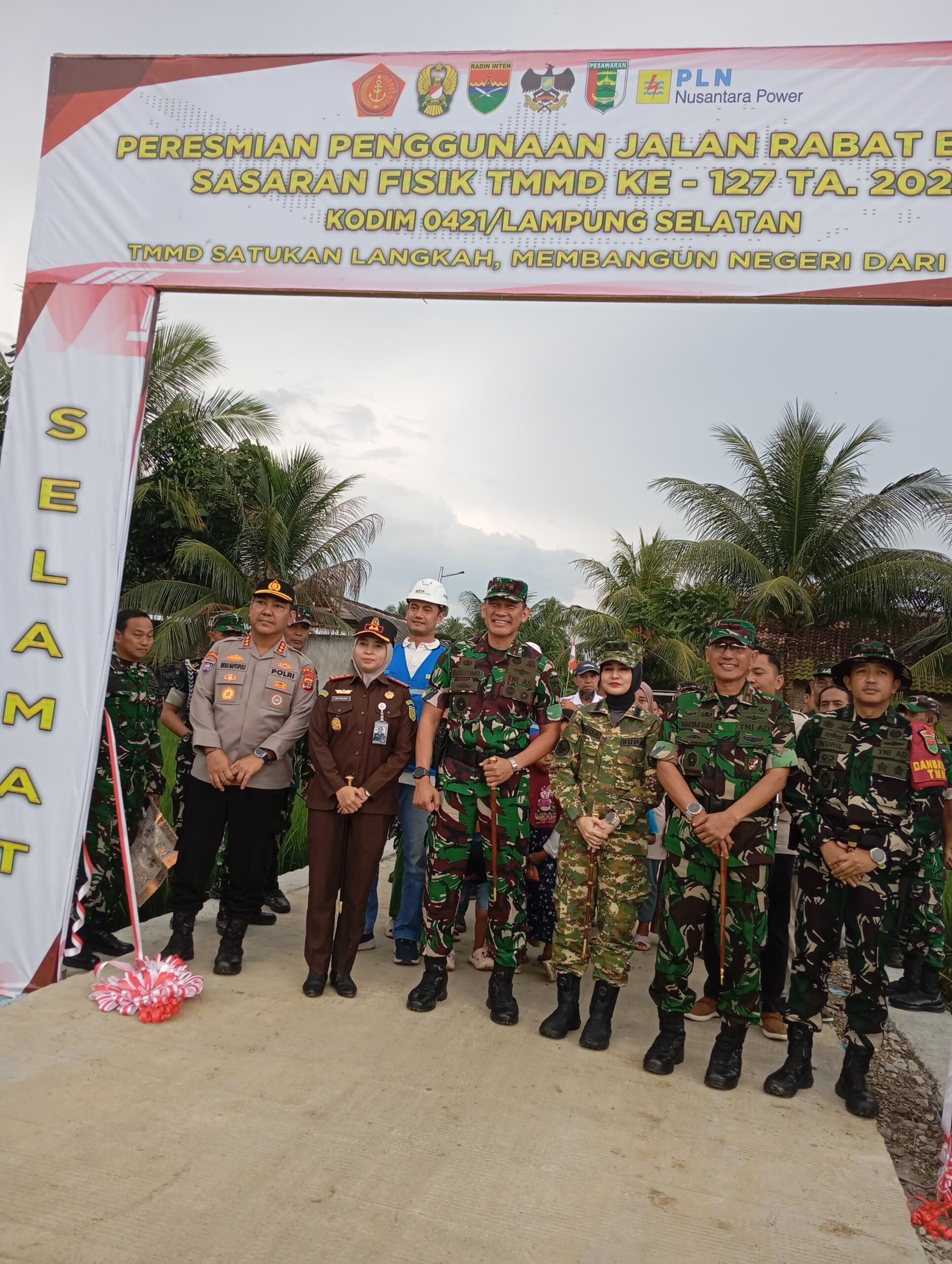 Upacara penutupan Tentara Manunggal Membangun Desa (TMMD) ke-127 yang diselenggarakan oleh Kodim 0421/LS di Pesawaran berjalan dengan khidmat dan tertib. Acara tersebut dipimpin oleh Pangdam XXI/Radin Inten, Mayjen TNI Kristomei Sianturi, dan dihadiri oleh berbagai pejabat tinggi, termasuk perwakilan Gubernur Lampung melalui Kepala Dinas Pemdes dan Transmigrasi serta Danrem 043/Gatam.