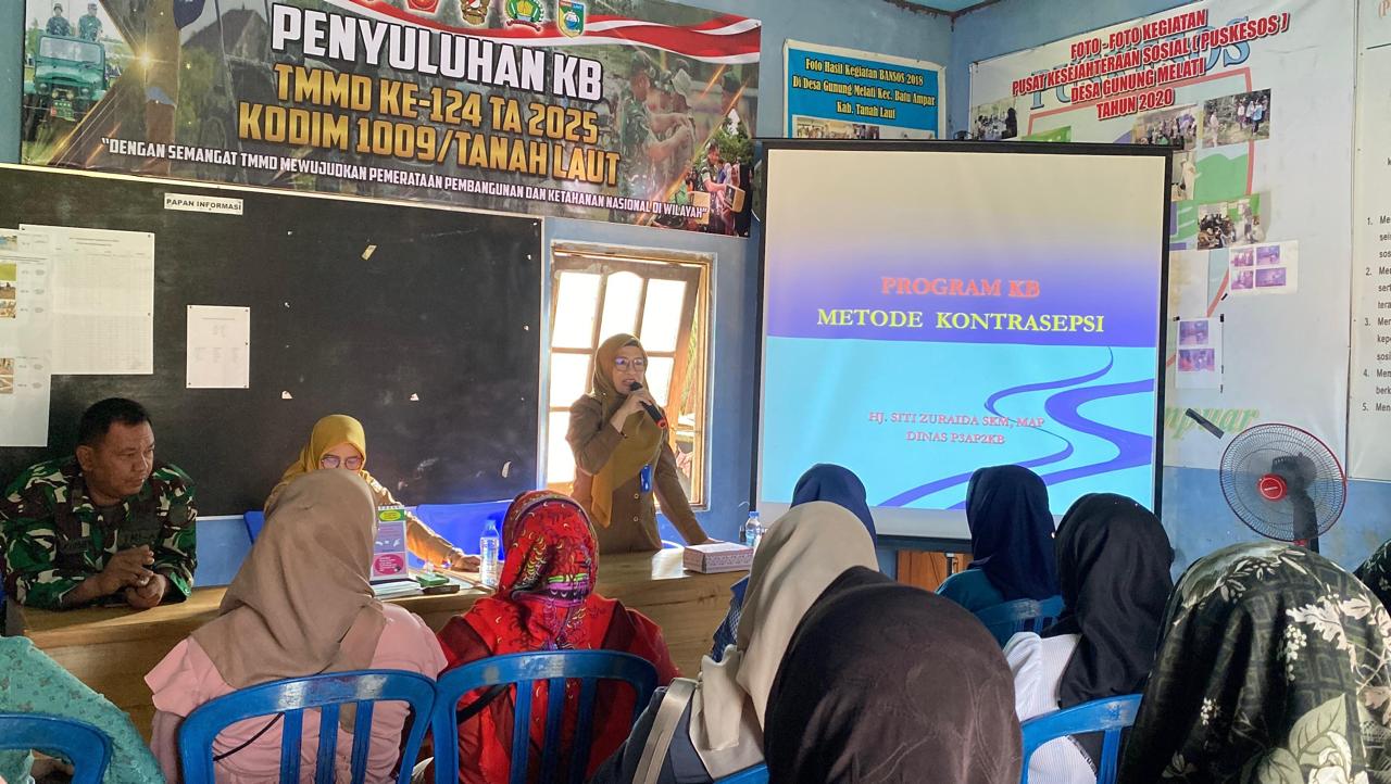 TANAH LAUT – Melalui Dinas Pengendalian Penduduk, Keluarga Berencana, Pemberdayaan Perempuan, dan Perlindungan Anak (DP2KBP3A) Kabupaten Tanah Laut, Satgas TMMD ke-124 Kodim 1009/Tla Kembali melanjutkan kegiatan di sasaran non fisik berupa pemberian penyuluhan Keluarga Berencana (KB) kepada perwakilan warga Desa Gunung Melati, Kecamatan Batu Ampar, Kab. Tanah Laut, Senin (26/05/2025).