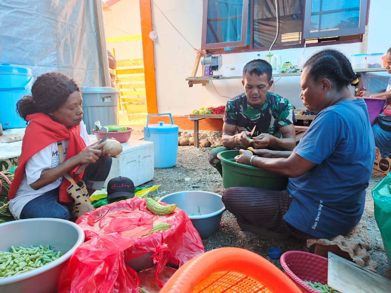 Manokwari — Di Kampung Tanah Rubuh, Program TMMD ke-128 yang diusung oleh Kodim 1801/Manokwari mendapat dukungan yang luar biasa dari warga setempat. Terutama para mama-mama Papua yang menunjukkan kepedulian dengan berkontribusi di dapur umum Satgas.