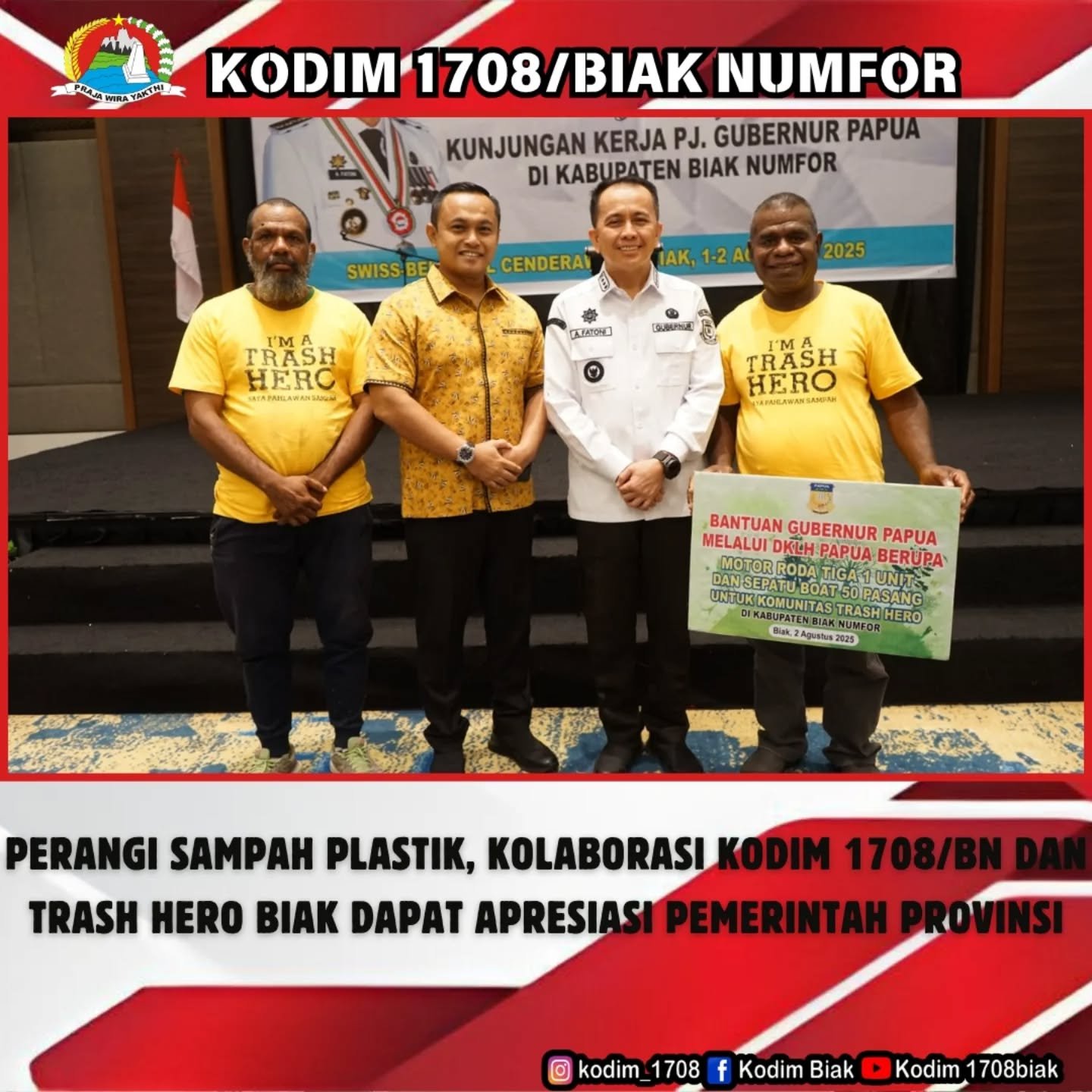 Motor tiga roda dan sepatu boat diserahkan secara langsung oleh Pj Gubernur Papua kepada Ketua Trash Hero Biak, Jack Rumbekwan. Bantuan ini diberikan sebagai bentuk dukungan pemerintah terhadap aksi-aksi nyata yang telah dilakukan oleh komunitas pencinta lingkungan, khususnya Trash Hero Biak yang selama ini aktif bersama Kodim 1708/BN dalam mengatasi persoalan sampah plastik di wilayah Biak Numfor.