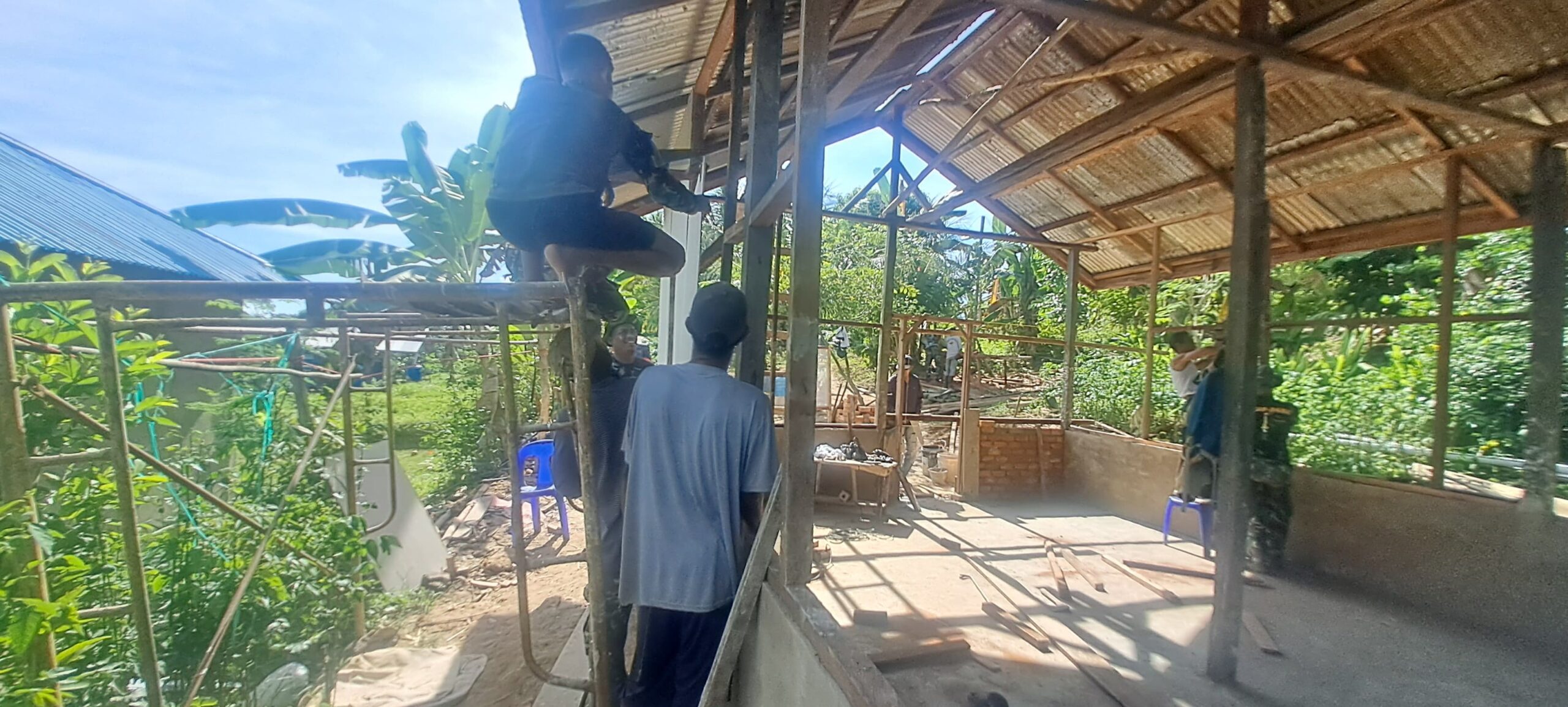 Salah satu rumah yang tengah ditangani dengan penuh ketelitian adalah milik Bapak Jailani. Di sini, semangat gotong royong begitu terasa. Terlihat jelas bagaimana tim Satgas TMMD bergerak cepat, memastikan setiap inci kerangka berdiri kokoh sebelum klasiboard menutupinya, membentuk siluet rumah yang semakin utuh dan menjanjikan.