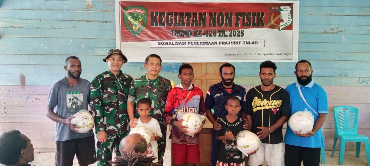 Selain penyerahan bantuan, kegiatan di Balai Kampung Waropko juga diisi dengan sosialisasi penerimaan prajurit TNI AD, memberikan informasi dan motivasi kepada para pemuda setempat agar berani bercita-cita menjadi bagian dari TNI AD.
