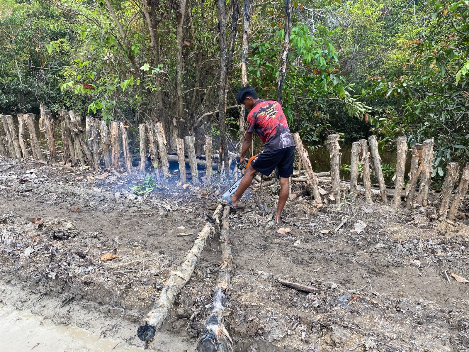 Barito Selatan – Dalam rangka mendukung kelancaran pembukaan jalan di Desa Talio, Kecamatan Karau Kuala, Kabupaten Barito Selatan, Satgas TMMD Kodim 1012/Buntok bersama warga setempat masih giat menyiapkan kayu untuk cerucuk. Kayu cerucuk ini akan digunakan sebagai pondasi untuk menjaga kestabilan tanah di jalur yang tengah dibuka.