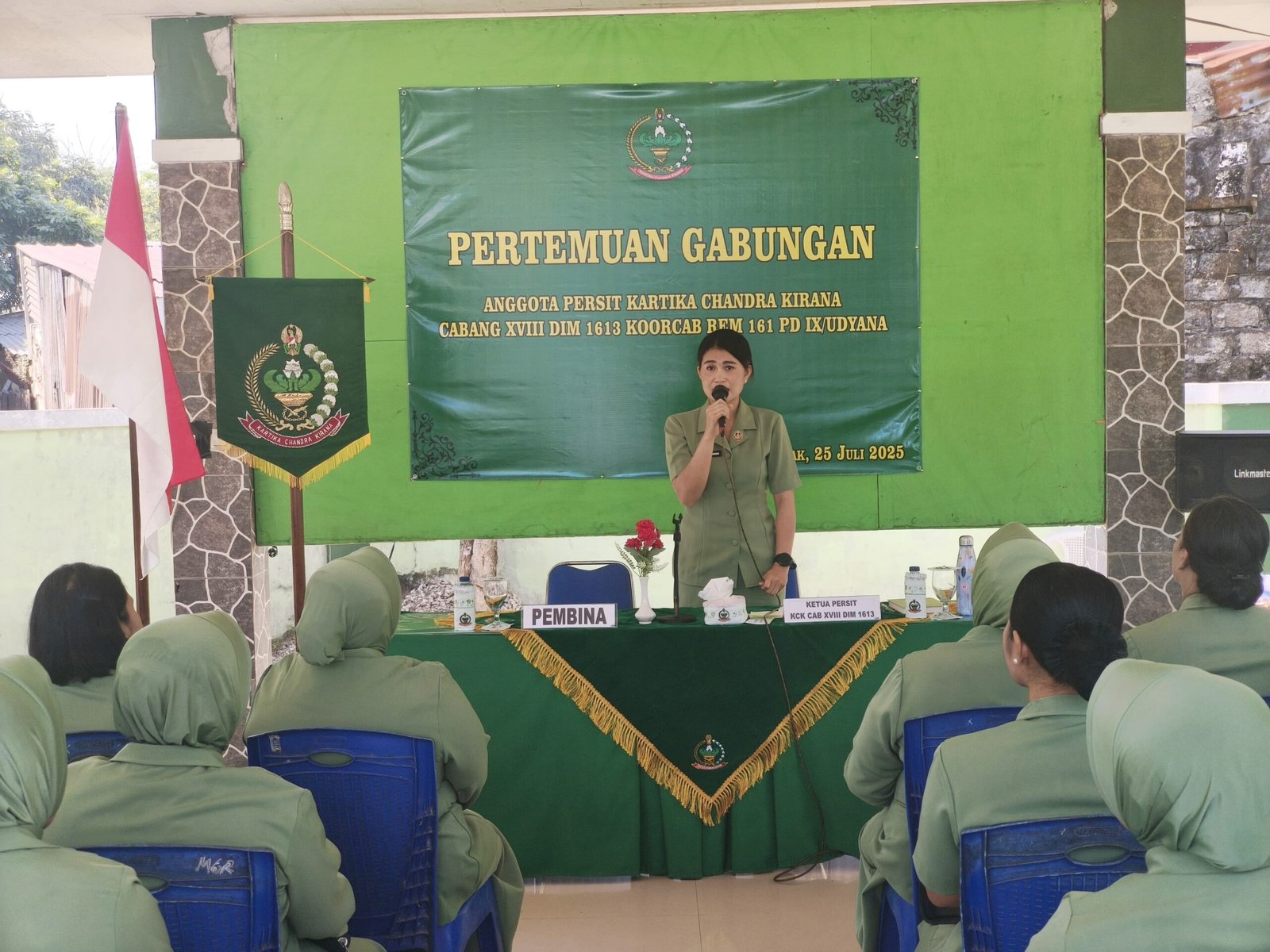 SUMBA BARAT – Komandan Kodim 1613/Sumba Barat, Letkol Inf Ignasius H. Sogen, S.E., M.Han., selaku Pembina Persit Kartika Chandra Kirana Cabang XVIII Dim 1613 Koorcab Rem 161 PD IX/Udayana, memberikan pengarahan kepada seluruh anggota Persit dalam kegiatan pertemuan gabungan yang berlangsung di Aula Makodim 1613/Sumba Barat, Jalan Gajah Mada, Kelurahan Maliti, Kecamatan Kota Waikabubak, Kabupaten Sumba Barat, Jumat (25/7/2025).