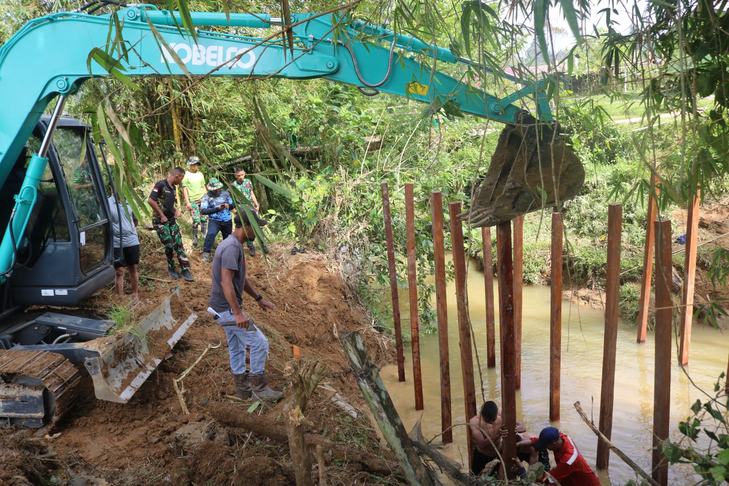 Kutai Timur – Pemasangan tiang pancang jembatan di Desa Suka Rahmat, Kecamatan Teluk Pandan, kini semakin cepat berkat kehadiran alat berat eksavator yang diterjunkan oleh Satgas TMMD Ke-125 Kodim 0909/Kutai Timur, Rabu (30/07).