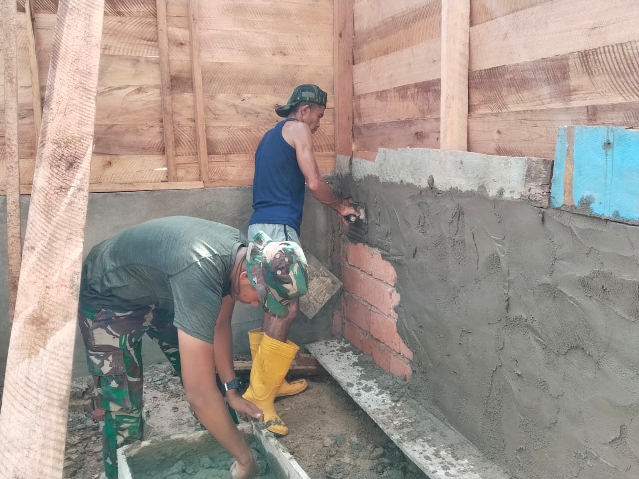 Dengan menggunakan sendok semen, para personel Satgas bekerja secara terampil untuk memastikan bahwa setiap sisi dinding rumah terlapisi dengan baik, menjadikan struktur bangunan lebih kuat dan tahan lama. Proses ini dianggap krusial untuk menjamin ketahanan dan kenyamanan tempat tinggal para penerima bantuan.