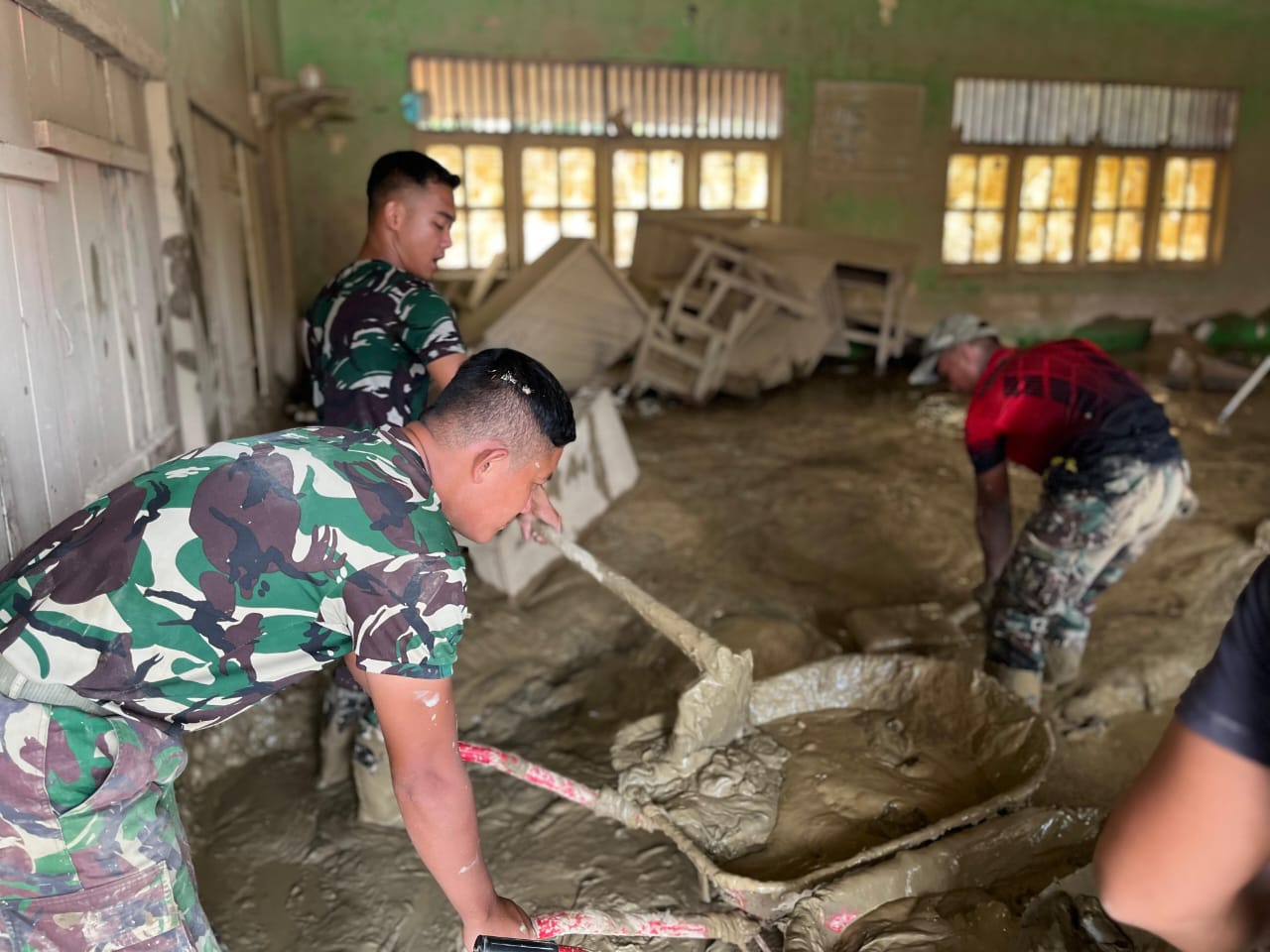 Sejak pagi hari, para prajurit terlihat bahu-membahu bersama warga dan pihak sekolah membersihkan ruang kelas, koridor, halaman sekolah, hingga fasilitas penunjang lainnya. Dengan peralatan seadanya, mereka mengeruk lumpur tebal serta menata kembali sarana pendidikan agar sekolah dapat segera difungsikan kembali.