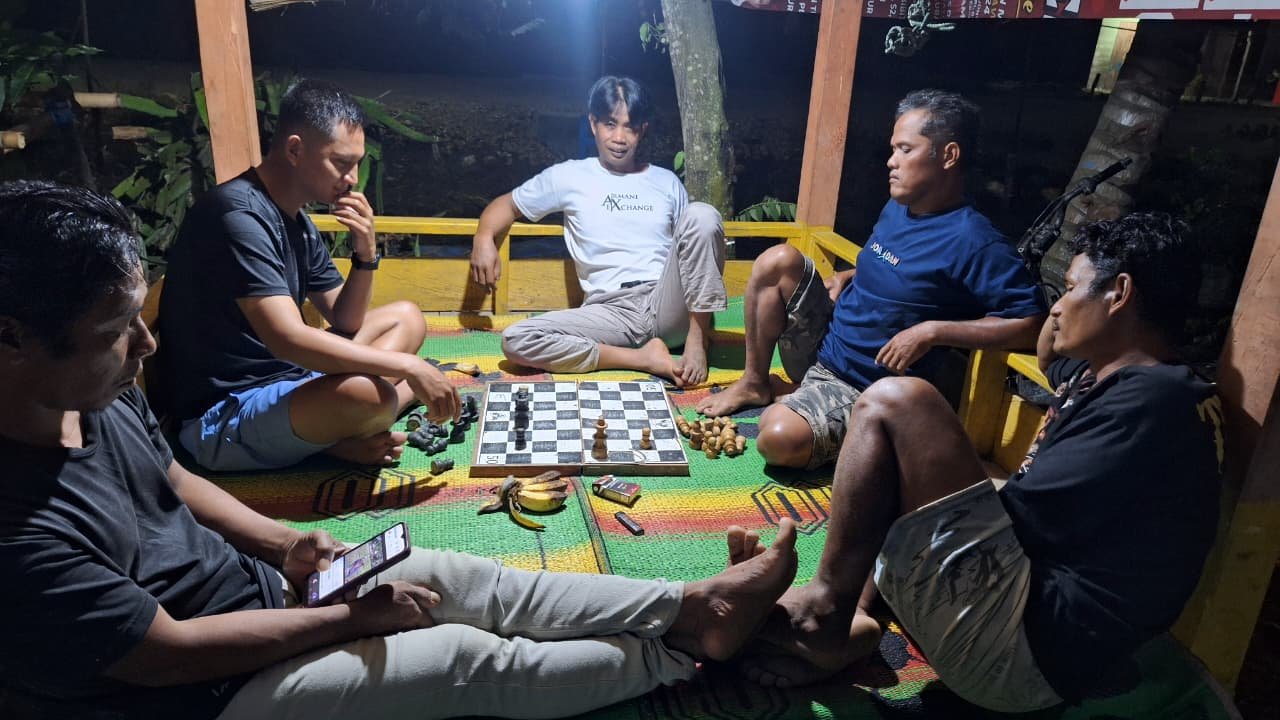Dengan penuh keakraban, Pratu Diki dan warga duduk bersama di bawah lampu malam. Sesekali terdengar canda tawa di sela-sela permainan, menambah hangat suasana.