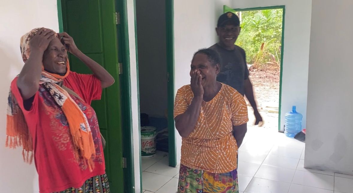 Ekspresi bahagia Ibu Evelina Surawi terpancar saat melihat kemajuan pembangunan rumahnya yang hampir selesai. Kebahagiaan ini memberikan motivasi tambahan bagi personel Satgas untuk menyelesaikan proyek dengan penuh semangat.