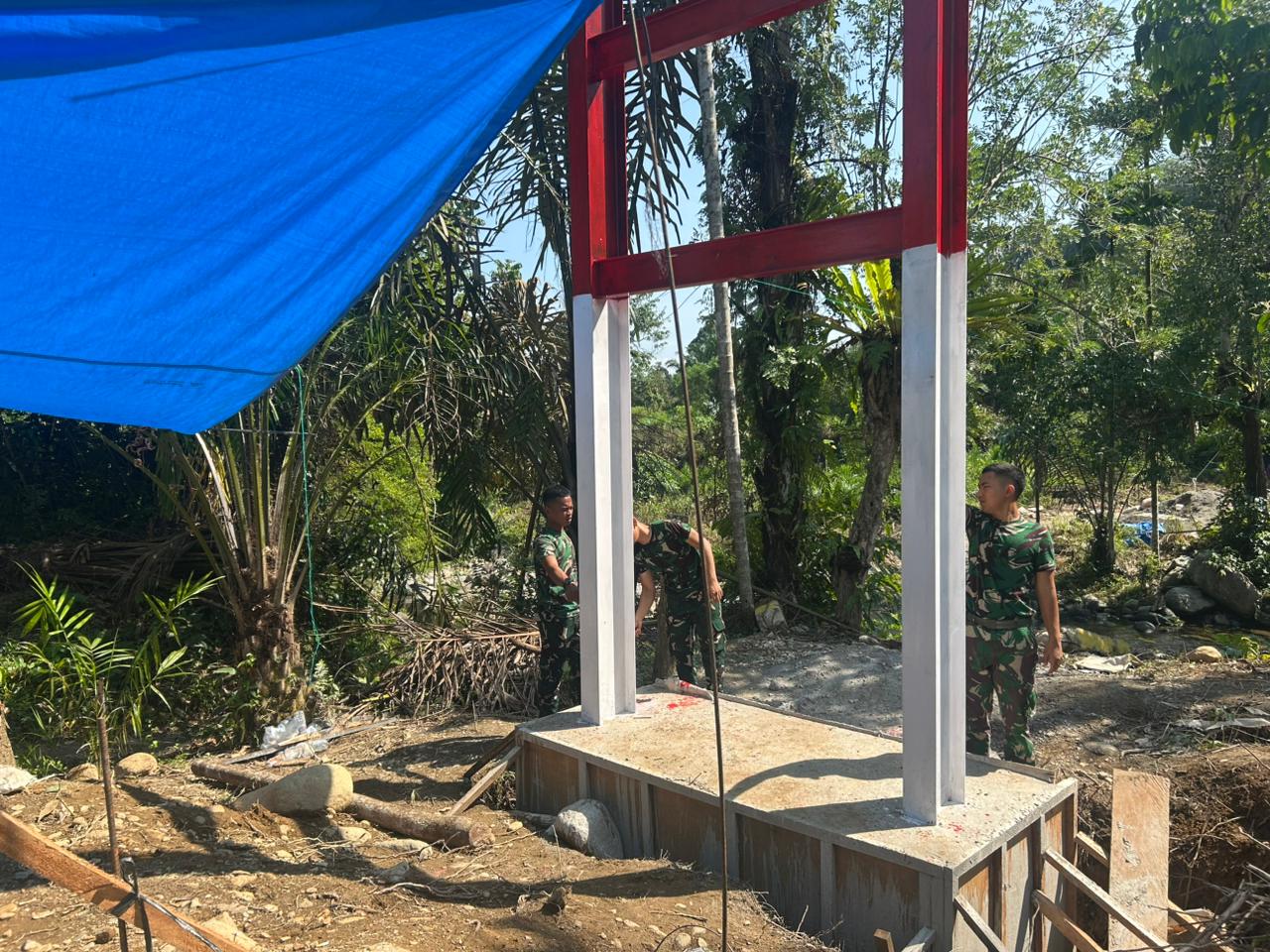 Pembersihan pondasi juga dilakukan secara teliti untuk menjamin stabilitas jembatan saat digunakan. Seluruh rangkaian pekerjaan berlangsung dalam suasana aman dan lancar, didukung oleh cuaca yang bersahabat serta partisipasi aktif masyarakat dan prajurit.