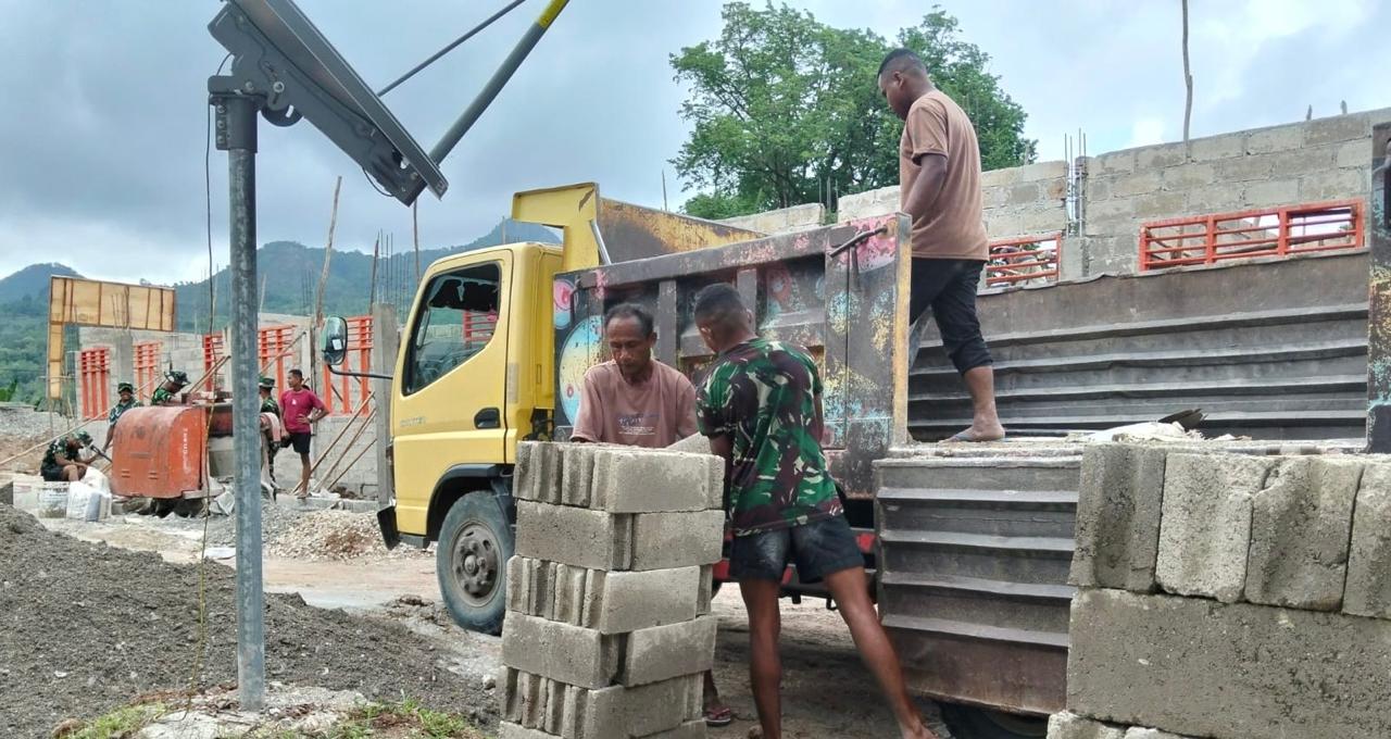 Material yang terdiri dari deretan sak semen, besi konstruksi, dan batako telah disusun dengan rapi, menandakan kesiapan untuk memasuki tahap pekerjaan selanjutnya. Keterlibatan aktif anggota Satgas dalam proses bongkar muat bersama warga setempat mencerminkan dedikasi dan semangat gotong royong yang tinggi.