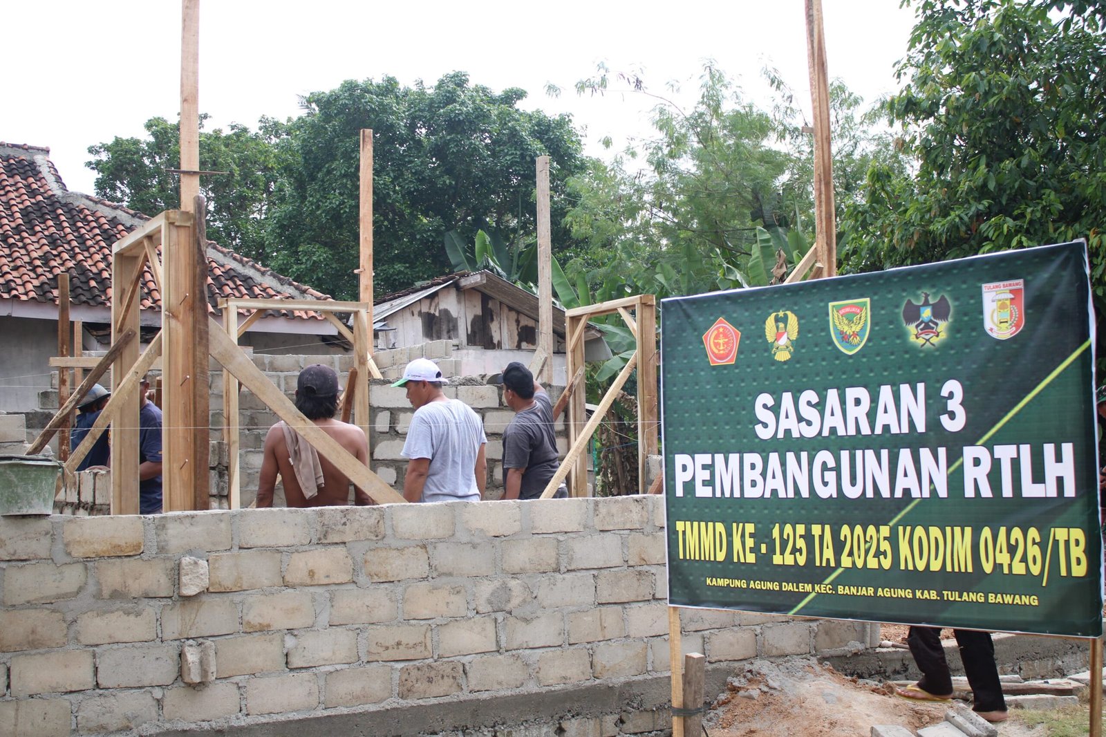 Program TMMD ke-125 Kodim 0426/Tulang Bawang terus menunjukkan hasil nyata. Di sasaran 3, pembangunan Rumah Tidak Layak Huni (RTLH) di Kampung Agung Dalam, Kecamatan Banjar Agung, pada Rabu (30/07/2025), telah memasuki tahap lanjutan dengan fokus utama pada pemasangan bata dinding rumah.