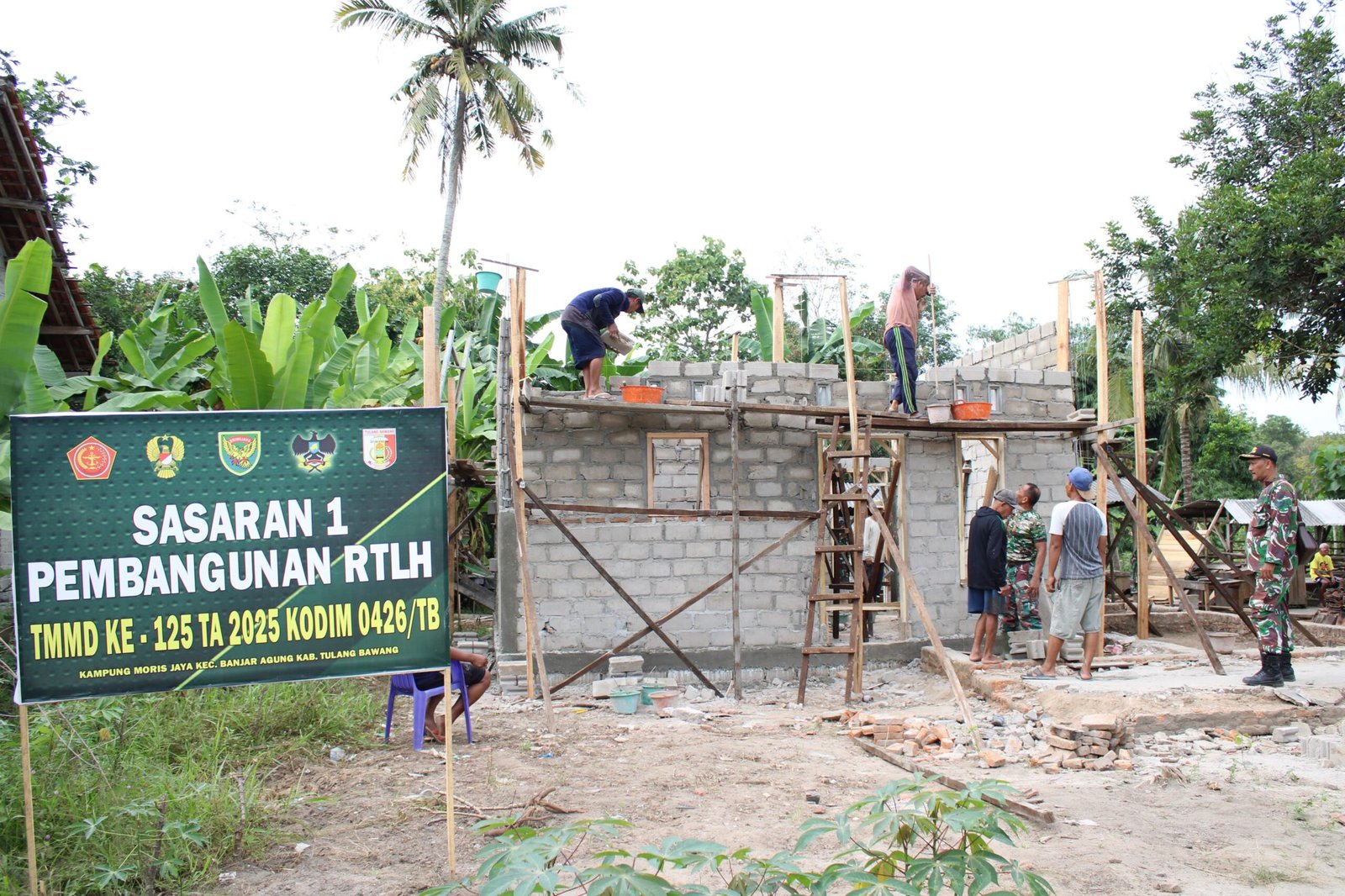 Tulang Bawang – Pembangunan Rumah Tidak Layak Huni (RTLH) dalam rangka kegiatan TNI Manunggal Membangun Desa (TMMD) ke-125 Kodim 0426/Tulang Bawang terus berlanjut. Pada sasaran 1 yang berlokasi di Kampung Moris Jaya, Kecamatan Banjar Agung, progres pembangunan saat ini telah memasuki tahap pemasangan batako untuk dinding rumah. Jumat (01/08/2025), Satgas TMMD terlihat bekerja dengan penuh semangat di tengah cuaca yang cukup terik.
