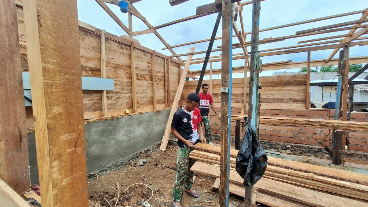 KENDARI – Pembangunan Rumah Tidak Layak Huni (RTLH) dalam program TNI Manunggal Membangun Desa (TMMD) ke-127 yang dilaksanakan oleh Kodim 1417/Kendari di Kelurahan Petoaha saat ini telah mencapai tahap 90 persen, pada Minggu (1/3). Proses pemasangan dinding kayu, yang merupakan elemen utama dalam struktur bangunan, hampir sepenuhnya rampung. Transformasi yang signifikan dapat dilihat, di mana rumah yang sebelumnya berada dalam kondisi kurang layak kini telah berubah menjadi hunian yang lebih kuat dan aman.