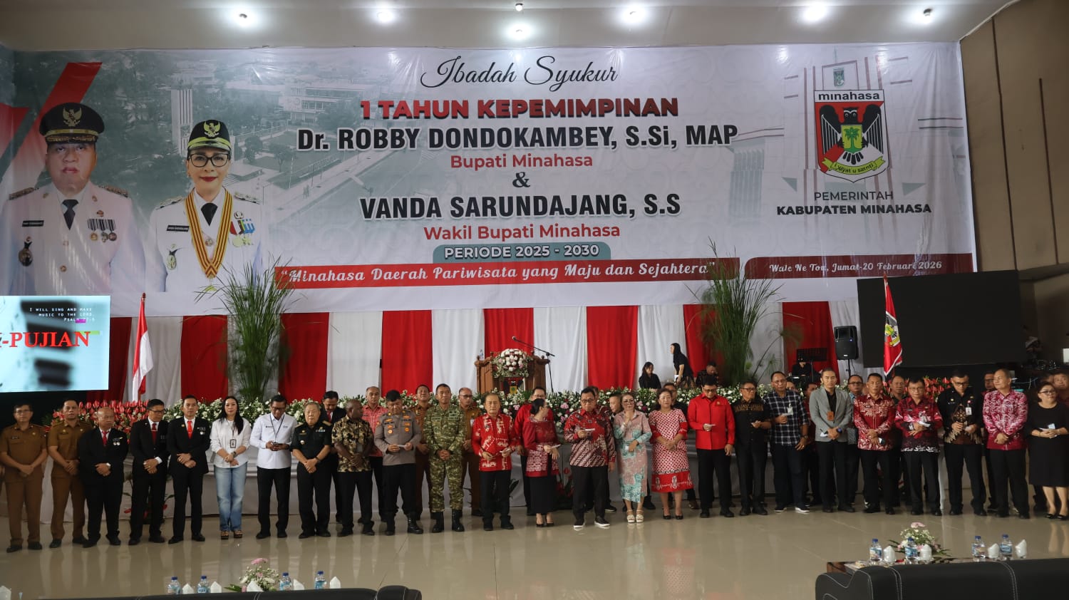 Minahasa, – Pada Jumat, 20 Februari 2026, Komandan Kodim 1302/Minahasa Letkol Inf Bonaventura Ageng F. S. turut serta dalam Ibadah Syukur yang memperingati satu tahun kepemimpinan Bupati Minahasa Dr. Robby Dondokambey S.Si. MAP. dan Wakil Bupati Vanda Sarundajang S.S. Acara ini berlangsung di Gedung Wale Ne Tou, Kelurahan Sasaran, Kecamatan Tondano Utara, Kabupaten Minahasa, yang dihadiri sekitar 500 orang. Ibadah syukur dipimpin oleh Ketua Sinode Gereja Masehi Injili di Minahasa (GMIM) Tondano, Dr. Antonius Sompe, dan berlangsung khidmat, dilengkapi dengan puji-pujian dari Forkopimda dan jajaran pemerintah daerah. Selanjutnya, dilakukan pemotongan tumpeng oleh Bupati dan Wakil Bupati, serta penyerahan Piagam Satya Lencana kepada sejumlah PNS. Sesi pemutaran video yang menampilkan kilas balik satu tahun pemerintahan juga menjadi bagian dari acara ini. Dalam sambutannya, Bupati Robby Dondokambey menekankan komitmennya bersama Wakil Bupati untuk memajukan daerah, serta mengucapkan terima kasih kepada Forkopimda, ASN, dan masyarakat atas dukungan yang diberikan selama setahun terakhir. Letkol Inf Bonaventura Ageng F. S. juga menyatakan kesiapannya untuk bersinergi dengan pemerintah daerah dalam mendukung pembangunan dan menjaga stabilitas keamanan demi kesejahteraan masyarakat Minahasa. Turut hadir dalam acara ini adalah Ketua TP-PKK Kabupaten Minahasa Ny. Martina Watok Dondokambey Lengkong S.E., Ketua DPRD Kabupaten Minahasa Drs. Robby Longkutoy, MM, serta berbagai perwakilan dari Forkopimda dan perangkat daerah lainnya. Acara ditutup dengan sesi foto bersama dan berakhir pada pukul 12.00 WITA dengan tertib dan aman.