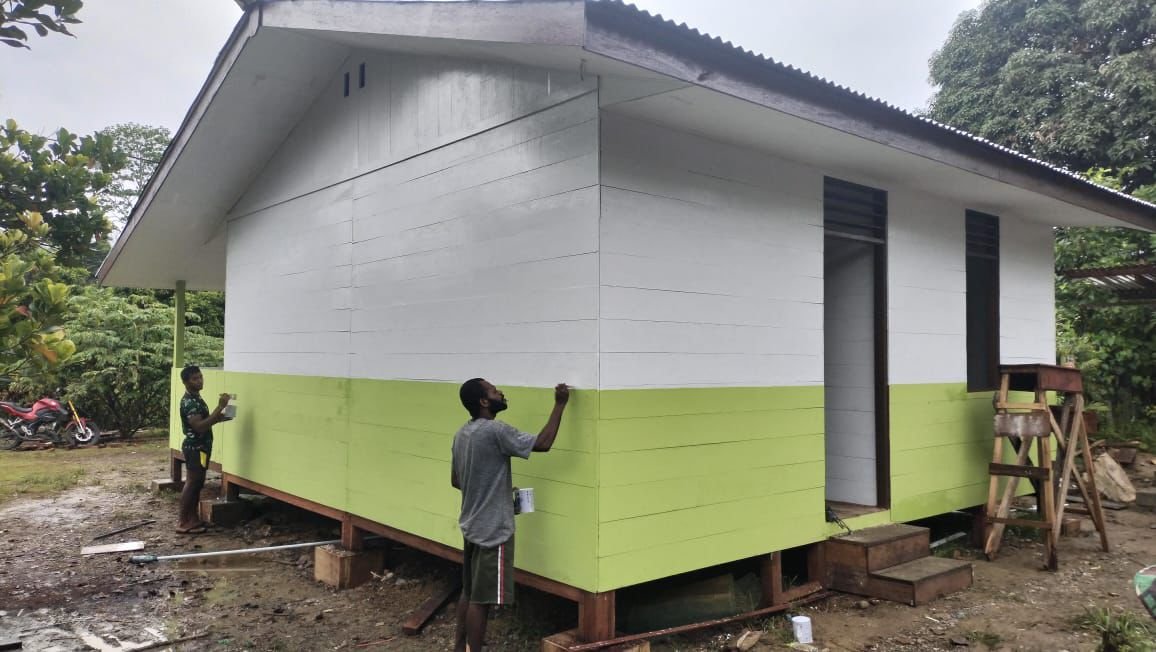 Pengecatan dilakukan secara menyeluruh pada bagian dinding luar dan dalam rumah. Tahap ini bertujuan memberikan tampilan yang lebih rapi dan bersih, sekaligus melindungi permukaan dinding dari cuaca tropis Papua yang lembap dan panas.