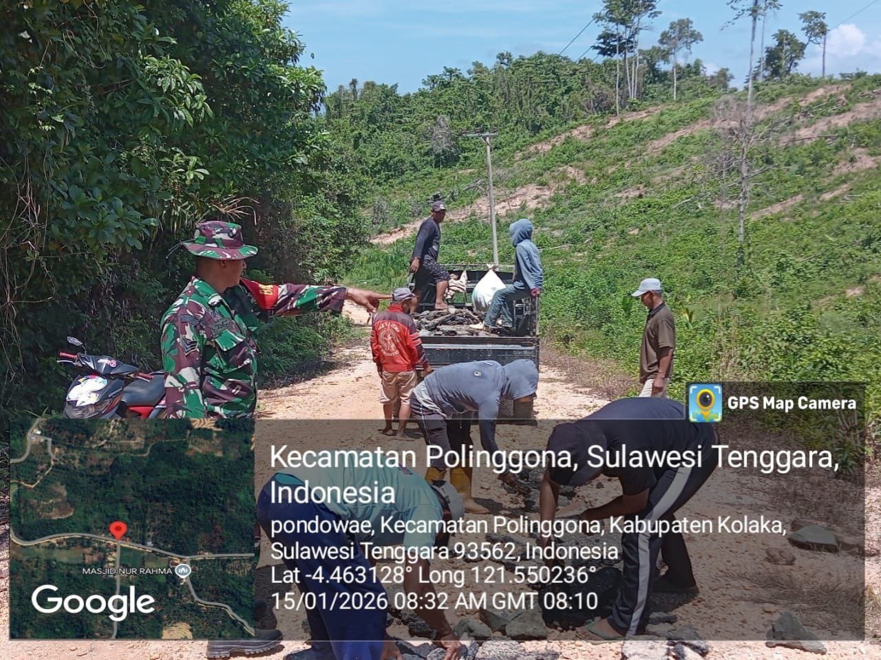 Kolaka – Pada Kamis, 15 Januari 2026, Serka Haris S., Bintara Pembina Desa (Babinsa) dari Koramil 1412-07/Watubangga, memimpin kegiatan kerja bakti di Desa Pondowae, Kecamatan Polinggona, Kabupaten Kolaka. Kegiatan ini melibatkan sejumlah warga setempat yang secara sukarela ikut berpartisipasi dalam memperbaiki akses jalan desa yang selama ini mengalami kerusakan.